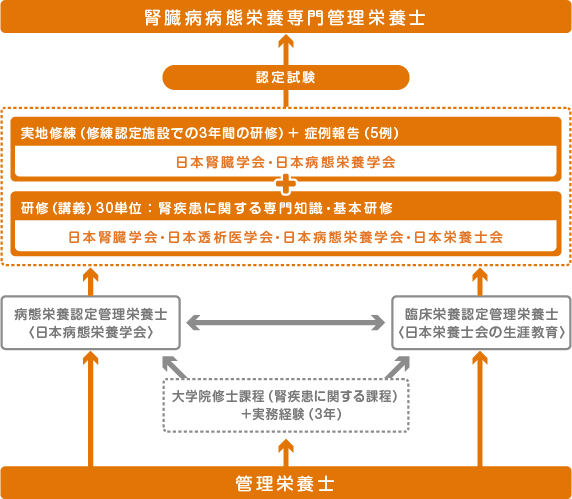腎臓病に関連する病態と栄養の知識および専門的技術を習得し、臨床経験を積んだ管理栄養士を「腎臓病病態栄養専門管理栄養士」として、平成27(2015)年度より、一般社団法人 日本病態栄養学会と公益社団法人 日本栄養士会の共同認定として、また、一般社団法人 日本腎臓学会とも連携した制度としてスタートしました。
