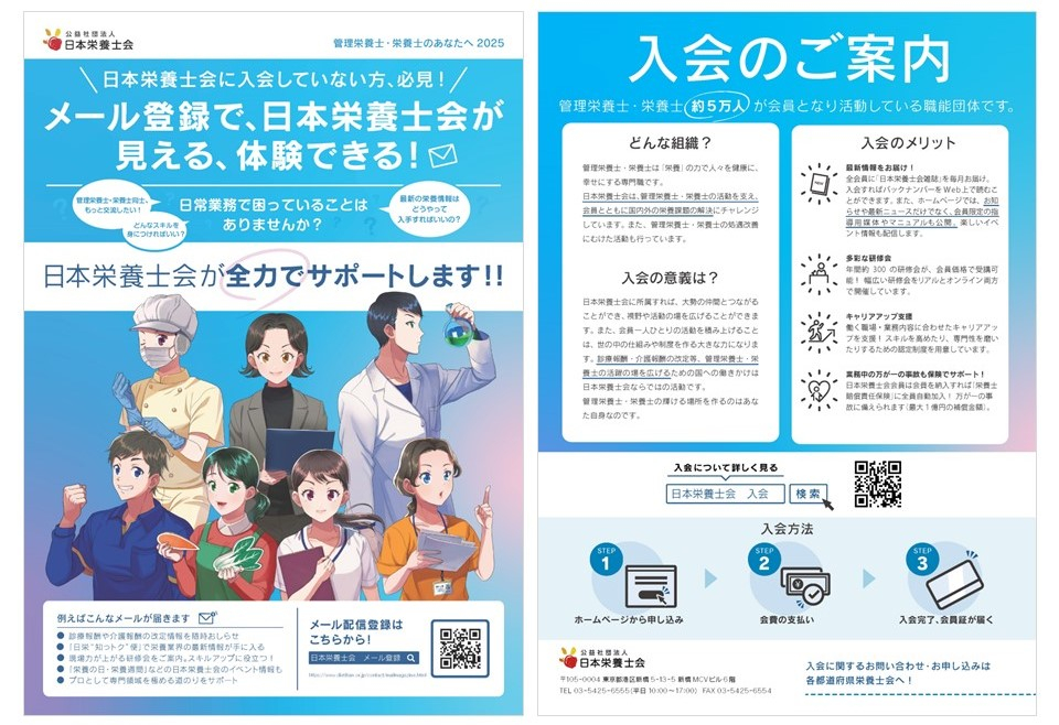 2025年、これらをより大きく展開するために組織力の強化を掲げ、一人でも多くの方に会員になっていただくよう、非会員を対象とした、メール登録推奨チラシ「管理栄養士・栄養士のあなたへ 2025」を制作しました。