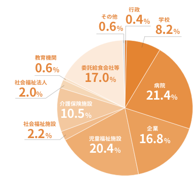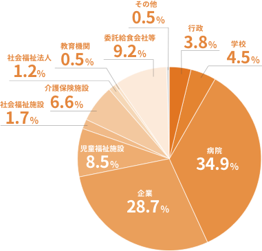 栄養士業務の就職者数のうち、管理栄養士養成施設卒業では、病院、企業・健保への就職が半数以上を、栄養士養成施設卒業では、病院、児童福祉施設、委託給食会社等、企業・健保への就職が7割以上を占めています。 就業の分野が広いことがうかがえます。