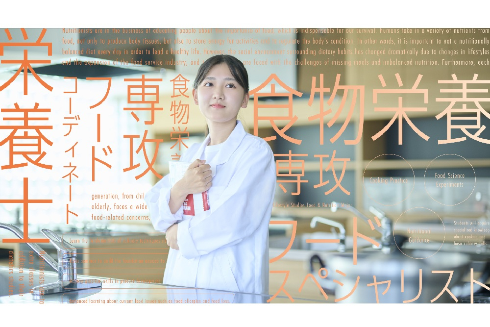 管理栄養士・栄養士の養成として栄養と健康、医療、福祉、食環境や食育などの専門知識の修得の他、健康実践指導者やNR・サプリメントアドバイザー資格取得にも対応。地域や医療分野で活躍できる人材を育成します。