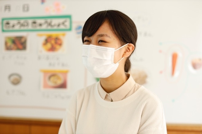 小中学生の頃、学校の給食が大好きだったんです。高校生になって進路を考えたときに、給食が学校生活の楽しみだったことが心に残っていて、私がそうだったように子どもたちの楽しみになるような給食を作れたらいいなと思ったのがきっかけでした。それに、子どもたちに楽しんでもらえることが、自分自身にとっても楽しい仕事に繋がるのではないかと思いました。そこから、管理栄養士という職業を知り、進学先を決めました。