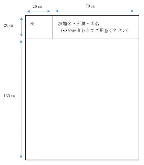 ①ポスターパネルは縦210cm、横90cmです。下図のようにパネル上部左20cmは演題番号(事務局で用意します)、残り右70cmは演題名、演者名、所属に使用してください。展示有効スペースは160cm×90cmです。押しピンは、事務局にて用意いたします。