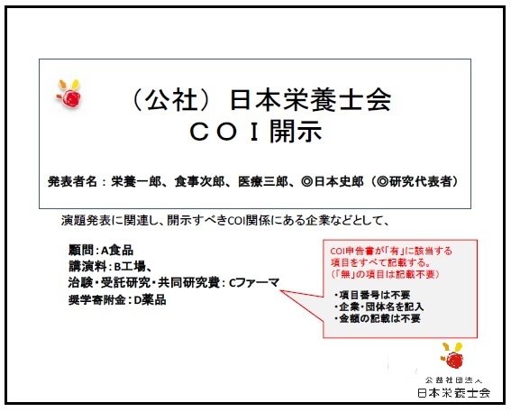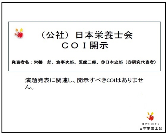 平成30年度全国栄養士大会では、示説発表される発表者は、利益相反(conflict of interest:COI)の有無にかかわらず、利益相反の状態を申告する必要があります。このため、当日の発表時に利益相反についての情報開示をお願いいたします。