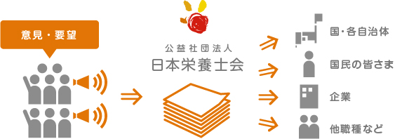 日本栄養士会では、全国の管理栄養士・栄養士からのさまざまな声を集約し、要望書や意見などにまとめ、国や自治体、国民の皆さま、企業、他職種などに提出・提案するなど、活発な取り組みを展開しています。以下に、最近の活動を紹介します。