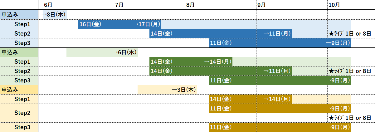 ※申込期日により、Step1の受講スタート時期は下記となります。なお、受講料のお支払い方法に関するご連絡は、下記の申込期日にご登録のメールアドレスへお送りします。