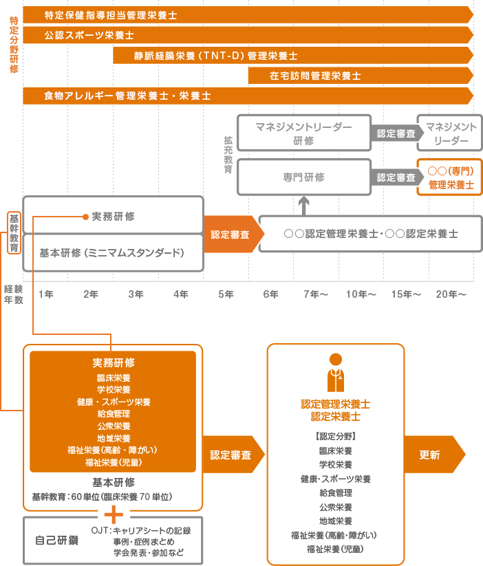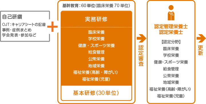 認定管理栄養士、認定栄簑士は、臨床栄養、学校栄養、健康・スポーツ栄養、給食管理、公衆栄養、地域栄養、福祉( 高齢・障がい、児童)栄養等の専門領域において、熟練した栄養に関する技術と知識を用いて、「栄養の指導」について責任をもって実践できるレベルに到達したことを認めるもので、所属施設の運営や他部門との連携に積極的に関与し、他者にモデルを示すことができるものとします。自己研鑽して、所定の単位や実績があれば認定試験を受験することができます。