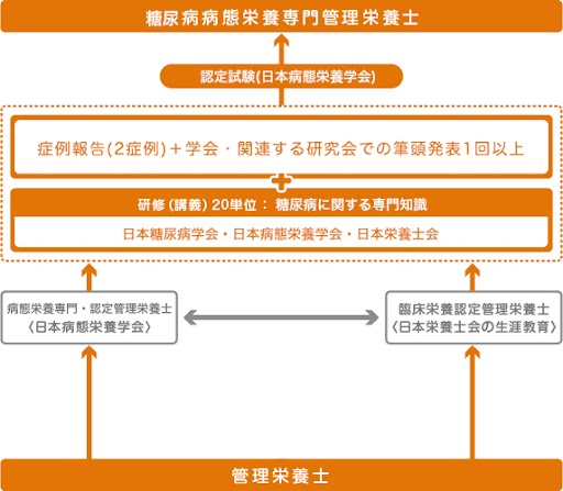 ①病態栄養認定管理栄養士・病態栄養専門管理栄養士または臨床栄養認定管理栄養士を取得後1年以上の実務経験を有していること。②本制度が認める糖尿病領域の講習を20単位以上を取得すること。