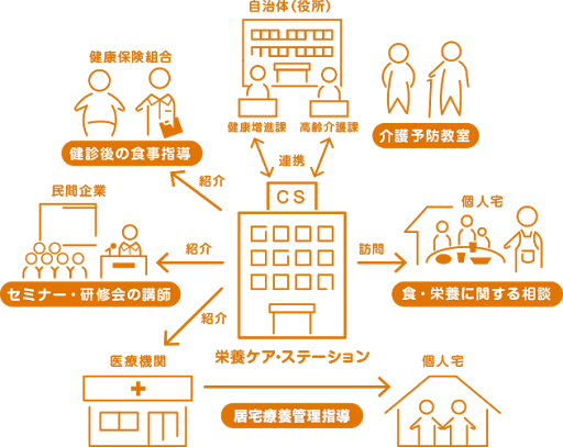 栄養ケア・ステーションは、管理栄養士・栄養士が地域住民の日常生活の場で栄養ケアを実施、提供するための仕組みであり、そのための地域密着型の拠点です。