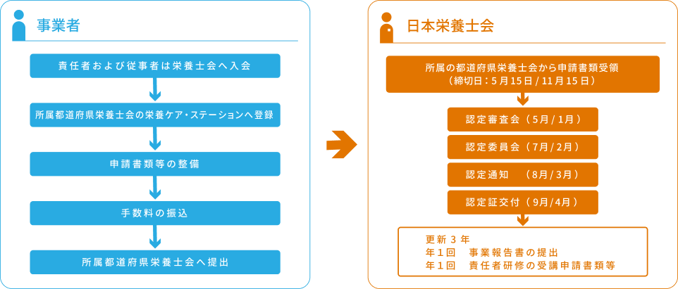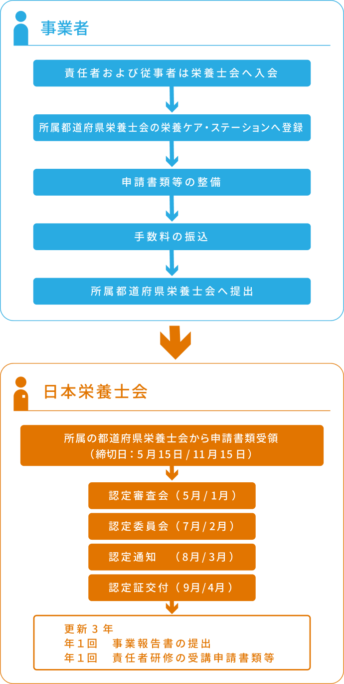 日本栄養士会では、管理栄養士が所属し栄養ケアを行う拠点を、認定栄養ケア・ステーションとして認定しています。事業者または個人の管理栄養士から申請を受け付け、年2回認定審査が行われます。