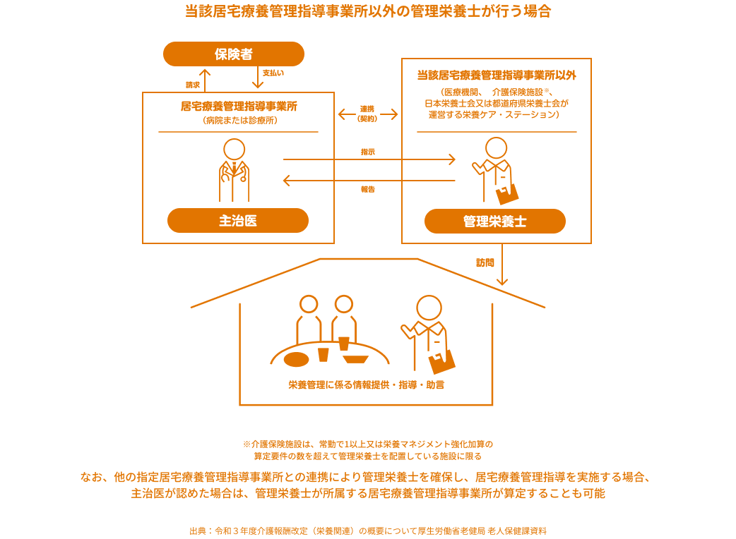 通院などが困難な方のために、管理栄養士がご家庭に定期的に訪問し、医師の指示に基づき、療養上必要な栄養や食事の管理及び指導を行います。栄養管理が必要な方がおられましたら、ご相談ください。なお、訪問栄養食事指導については、対象患者が要介護又は要支援認定を受けている場合は介護保険扱いとなり、認定を受けていない場合は医療保険扱いとなります。