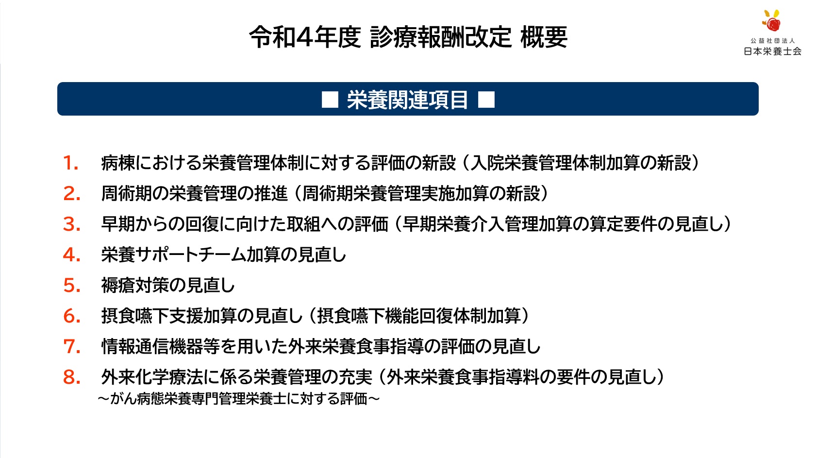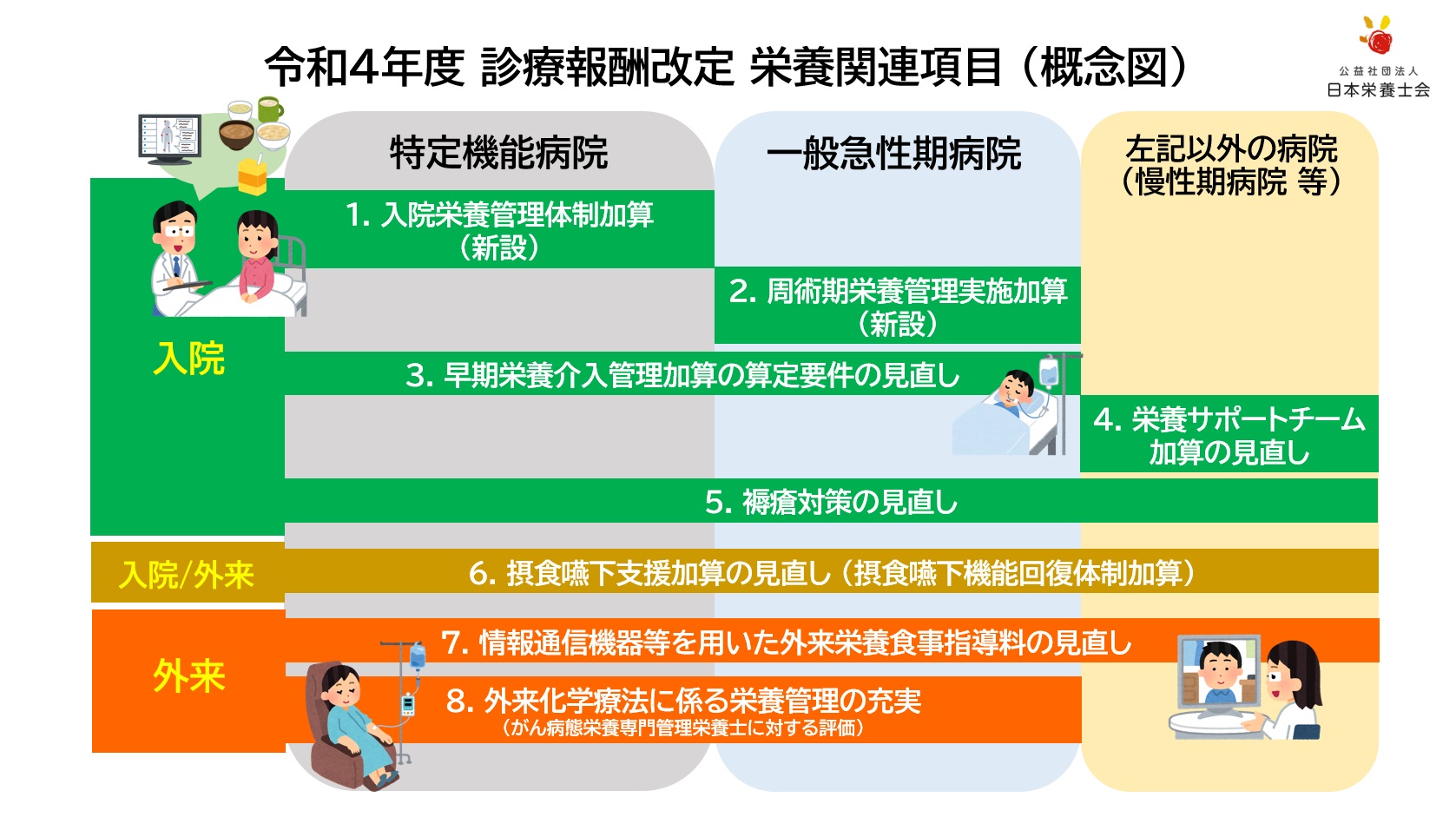 栄養政策・制度 トピックス お知らせ 2025/10/09 【診療報酬】「令和6年度診療報酬改定」厚生労働省による疑義解釈資料(vol.6) お知らせ 2025/01/06 【診療報酬】「令和6年度診療報酬改定」厚生労働省による疑義解釈資料(vol.5) お知らせ 2024/06/11 【診療報酬】「令和6年度診療報酬改定」に関する質問と回答まとめ お知らせ 2024/06/18 【介護報酬】「令和6年度介護報酬改定」に関する質問と回答まとめ お知らせ 2024/05/23 【障害福祉サービス等】「令和6年度障害福祉サービス等報酬改定」に関する質問と回答まとめ 管理栄養士・栄養士のみなさんへ、栄養政策・制度に関する情報等を、日本栄養士会からメールでお届けします。 メール登録 メール登録 ✕ 会員の方 メールアドレスを既に登録されている方には、日本栄養士会からのお知らせや研修会、ホームページなどの最新情報がメールで送られます。未登録の方は、マイページからご登録ください。 マイページ 会員以外の方※ 会員以外の方は、メール登録をすると、日本栄養士会からのお知らせや各種情報がメールで送られます。 メール登録 ※入会すると会員限定の情報や特典を受けることができます。入会案内はこちら 診療報酬・介護報酬・障害福祉サービス等報酬 診療報酬 NEW 令和6年度診療報酬改定のポイント 令和4年度診療報酬改定の情報 介護報酬 NEW 令和6年度介護報酬改定のポイント 令和3年度介護報酬の改定の情報 障害福祉サービス等報酬 NEW 令和6年度障害福祉サービス等報酬改定のポイント 栄養政策・制度に関するお役立ちリンク集 国の制度や方針から人員の配置基準など、管理栄養士・栄養士の業務に必要な情報を掲載しています。 制度・指針・調査・文献検索 危機管理 関連法規 配置規定