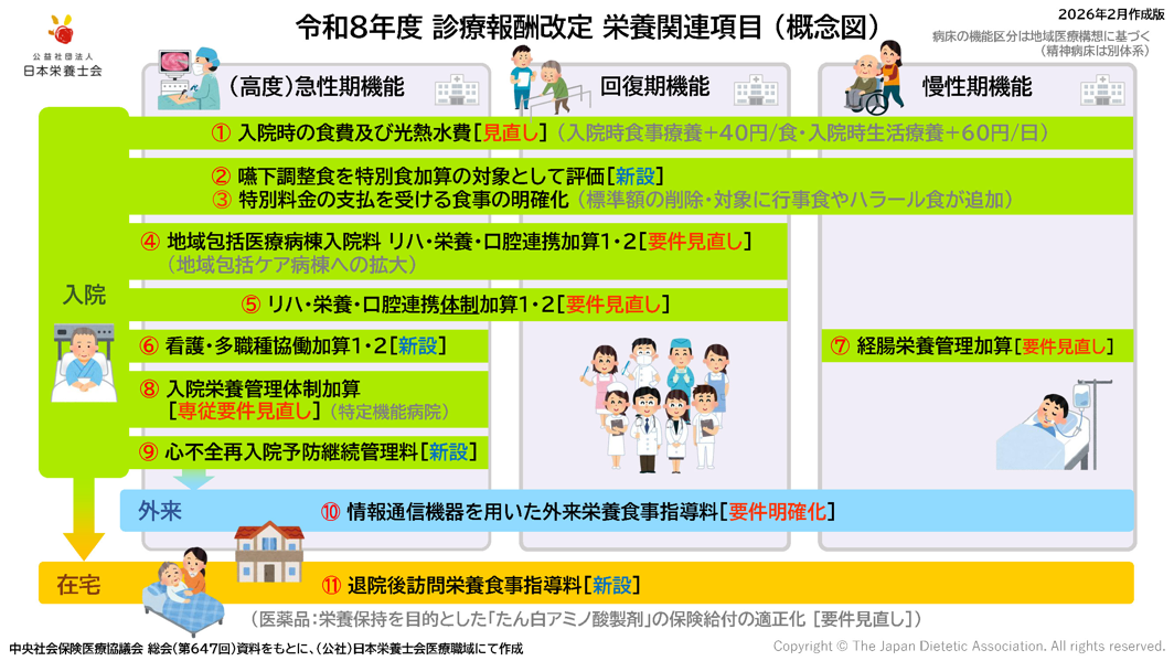 令和8年度診療報酬改定においては、入院・外来・在宅と多岐にわたって、栄養管理に関する評価の充実が図られました。