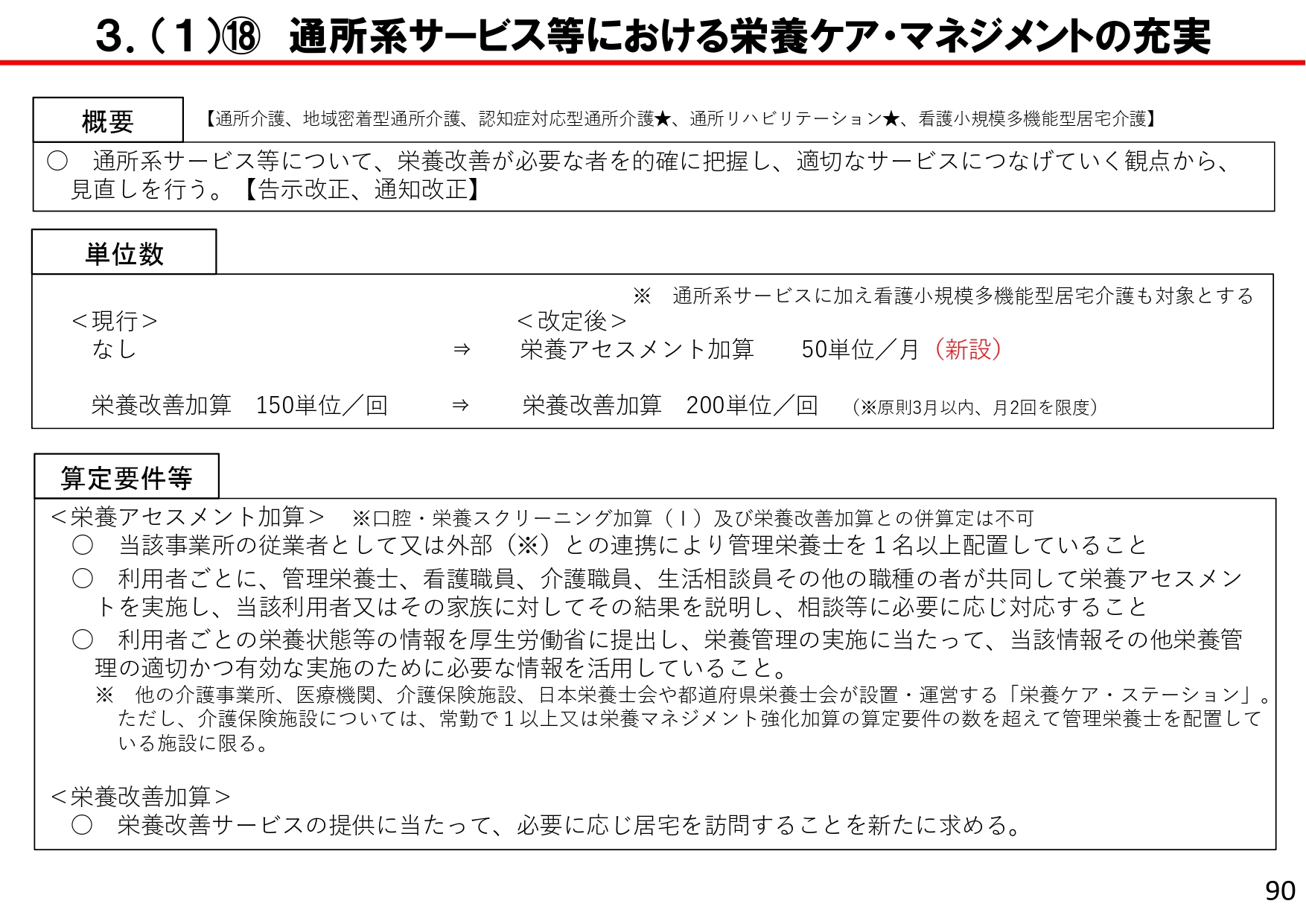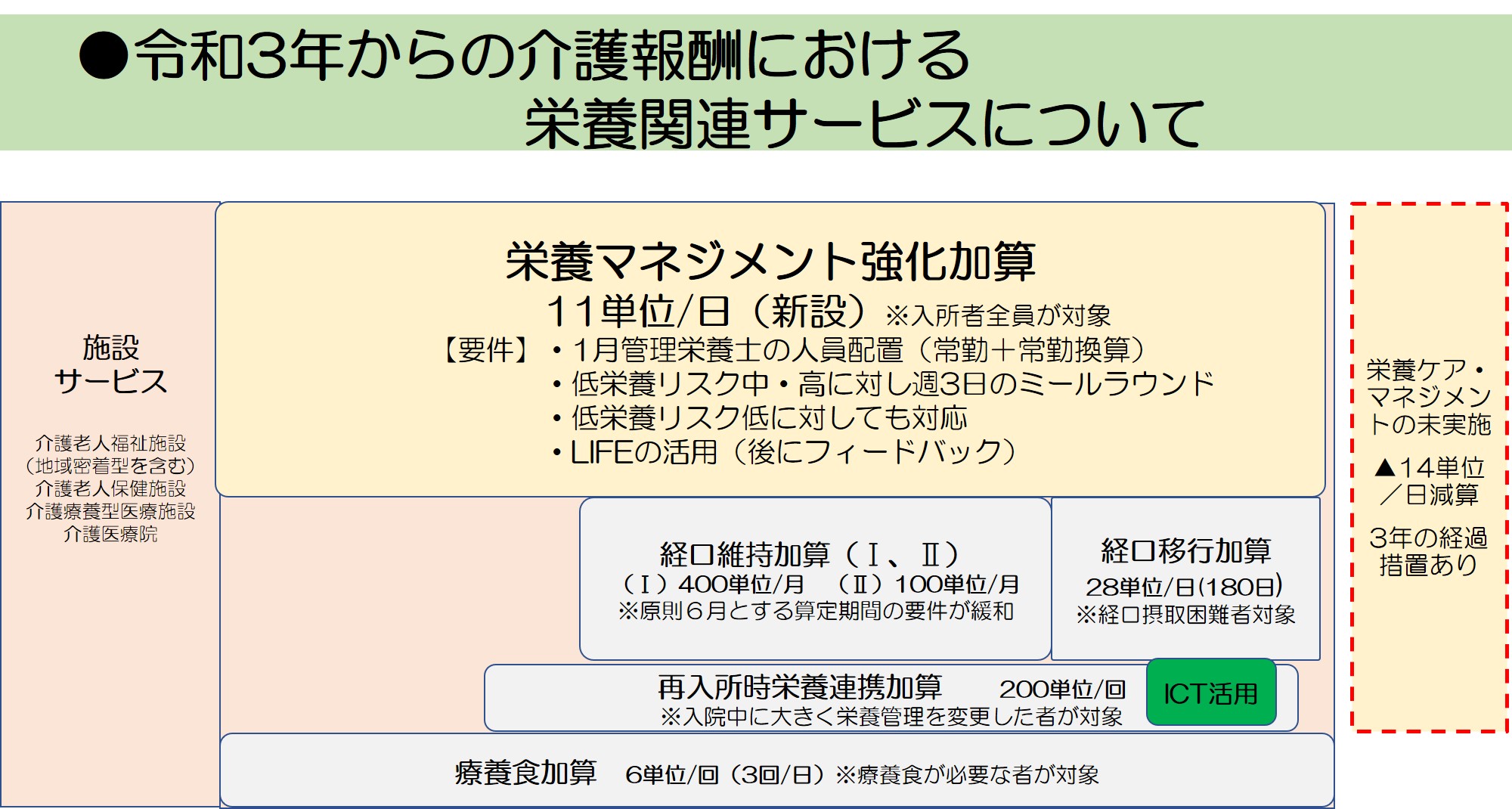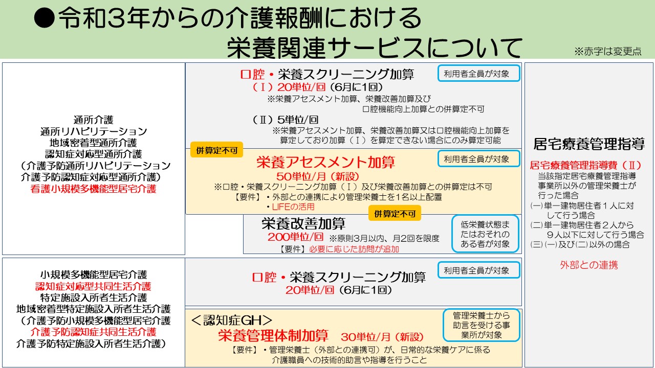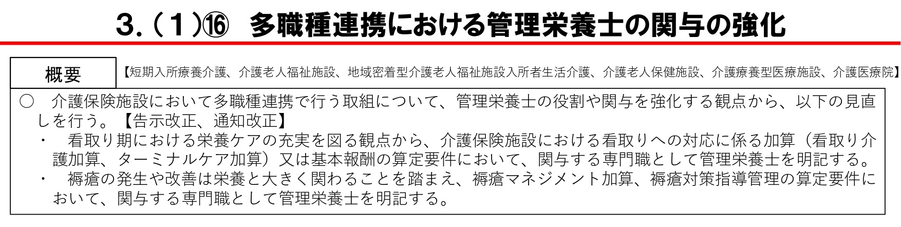 栄養政策・制度 トピックス お知らせ 2025/10/09 【診療報酬】「令和6年度診療報酬改定」厚生労働省による疑義解釈資料(vol.6) お知らせ 2025/01/06 【診療報酬】「令和6年度診療報酬改定」厚生労働省による疑義解釈資料(vol.5) お知らせ 2024/06/11 【診療報酬】「令和6年度診療報酬改定」に関する質問と回答まとめ お知らせ 2024/06/18 【介護報酬】「令和6年度介護報酬改定」に関する質問と回答まとめ お知らせ 2024/05/23 【障害福祉サービス等】「令和6年度障害福祉サービス等報酬改定」に関する質問と回答まとめ 管理栄養士・栄養士のみなさんへ、栄養政策・制度に関する情報等を、日本栄養士会からメールでお届けします。 メール登録 メール登録 ✕ 会員の方 メールアドレスを既に登録されている方には、日本栄養士会からのお知らせや研修会、ホームページなどの最新情報がメールで送られます。未登録の方は、マイページからご登録ください。 マイページ 会員以外の方※ 会員以外の方は、メール登録をすると、日本栄養士会からのお知らせや各種情報がメールで送られます。 メール登録 ※入会すると会員限定の情報や特典を受けることができます。入会案内はこちら 診療報酬・介護報酬・障害福祉サービス等報酬 診療報酬 NEW 令和6年度診療報酬改定のポイント 令和4年度診療報酬改定の情報 介護報酬 NEW 令和6年度介護報酬改定のポイント 令和3年度介護報酬の改定の情報 障害福祉サービス等報酬 NEW 令和6年度障害福祉サービス等報酬改定のポイント 栄養政策・制度に関するお役立ちリンク集 国の制度や方針から人員の配置基準など、管理栄養士・栄養士の業務に必要な情報を掲載しています。 制度・指針・調査・文献検索 危機管理 関連法規 配置規定