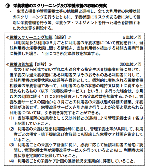 収入が一定額以下の利用者に対して、事業原則として当該施設内の調理室を使用して、食事の提供を行った場合に所定単位数を加算するという現行の要件に加え、①管理栄養士等が献立作成に関与または献立の確認を行い、②利用者ごとの摂食量の記録、③利用者ごとの体重の記録を行った場合に、所定単位数を加算することとなりました。