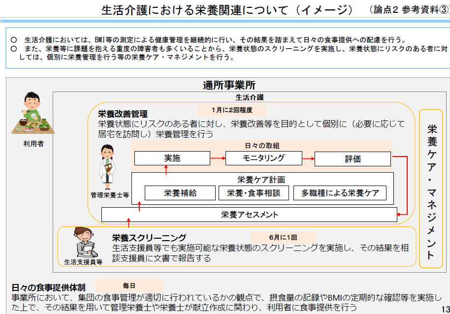 障害福祉サービス等報酬における通所系サービス(生活介護)には、栄養ケア・マネジメントの取り組みが位置付けられていませんでした。しかし、通所系サービスの利用者の日常生活における支援の必要性は、生活介護利用者に多く、また、健康・栄養状態や食べ方にも課題があることから、栄養改善が必要なものを的確に把握し、適切なサービスに繋げていく必要がありました。今回の改定では、介護保険における対応状況を参考に、生活介護においても生活支援員や管理栄養士等の多職種と連携し、全ての利用者の栄養状態のスクリーニングを行うとともに、栄養状態にリスクのある者に対して個別に栄養管理を行った場合を評価するための加算が新設されました。