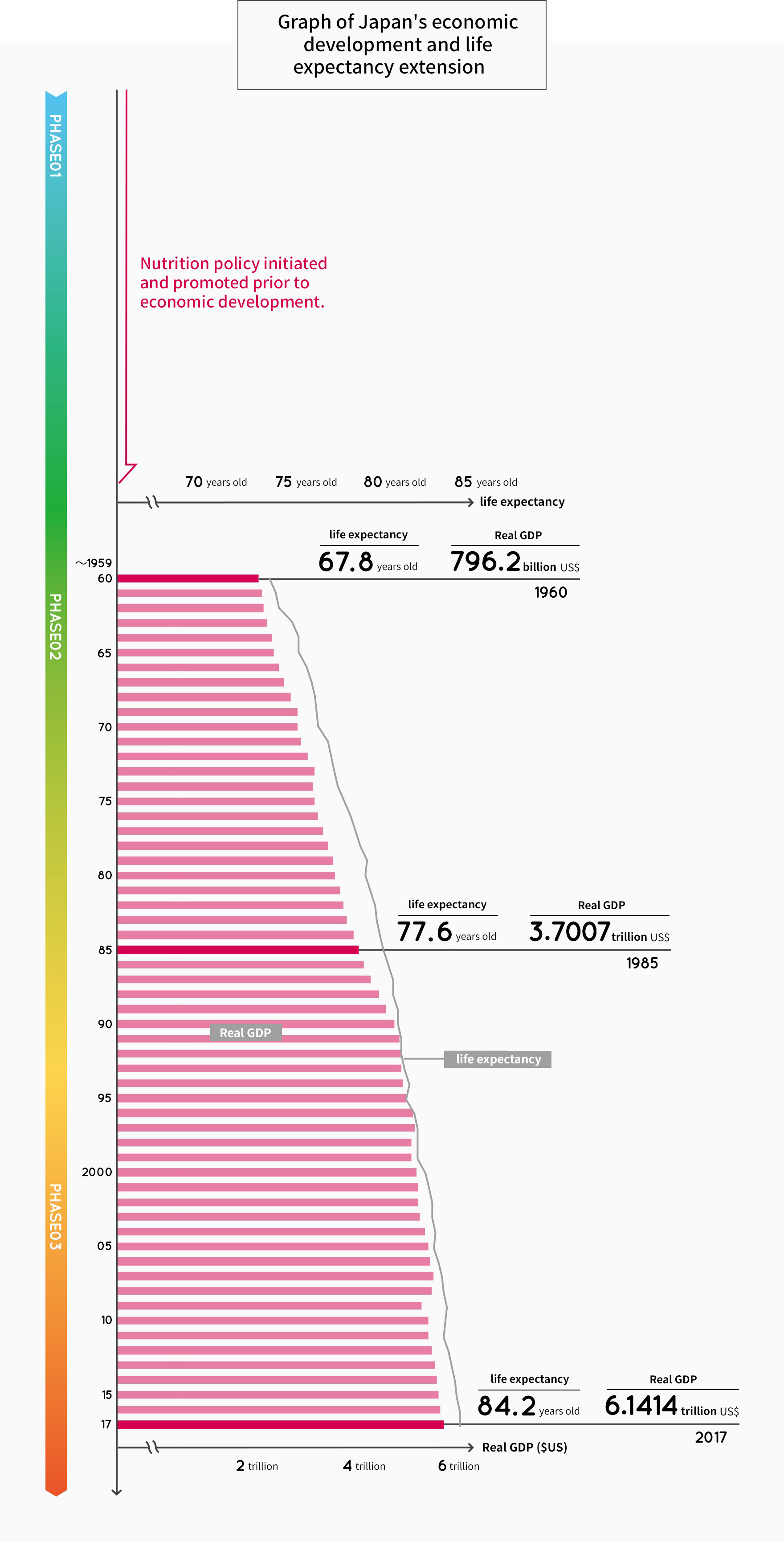“Japan Nutrition" means the following; Japan has solved malnutrition and created a modern nation of health and longevity by introducing nutritional science and nutrient-dense foods and cuisine since the Meiji era. In a manner of speaking, he succeeded in improving nutrition in a uniquely Japanese way by combining "culture and science." (From "Japan Nutrition, Unraveled by Nakamura Teiji," published by Daiichi Shuppan). Based largely on publicly available data from the Ministry of Health, Labor, and Welfare, here we reviews the 100-year history of Japan's nutrition policy, which combined "diet," "human resources," and "evidence" to leave no one behind. And that policy was developed before the increase in GDP and the increase in life expectancy.