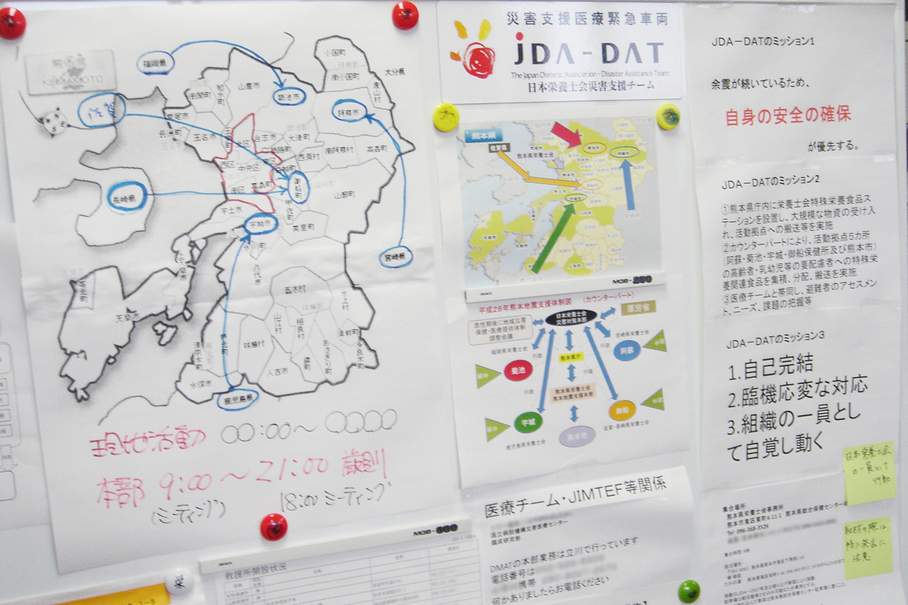 日本栄養士会が東日本大震災で初めて人的な支援を行った際、さまざまな課題に直面しました。たとえば、発災当初の派遣体制や情報収集の問題、管理栄養士・栄養士の災害時の栄養に関するスキルの問題、派遣者の食事・宿泊場所の確保の問題等。それによって支援する側も支援される側も非常に厳しい状況の中、活動を行っていました。そこで得た経験をもとに、JDA-DATの立ち上げにあたっては、支援・受援者側の両方が円滑に動けるよう体制作りの必要性を感じました。平成27年9月に茨城県常総市を中心に発生した関東・東北豪雨災害がJDA-DATとして初めて先遣隊だけでなく本隊を派遣した支援活動でしたが、支援・受援者側双方に配慮された体制のもと、滞りなく支援を行うことができました。また、この時に確立された支援方法のひとつに、特殊食品等の物資の円滑な搬送を行う「特殊栄養食品ステーション」の設置があります。この経験は、今回の熊本地震でも大いに生かされ、多くの要配慮者に必要な物資を届けることができました。