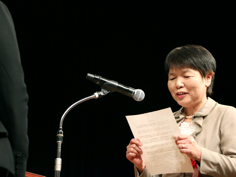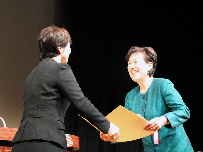 厚生労働省健康局河野美穂栄養指導室長より厚生労働大臣からの祝辞が、兵庫県太田稔明健康福祉部長より兵庫県知事の祝辞がそれぞれ読み上げられ、受賞者を代表して兵庫県の山本医津子さんが「この受賞を励みに、なお一層の研鑽を重ね、それぞれの活動に精進してまいります」と謝辞を述べて、閉会しました。閉会後は、授与された賞状を手に家族と記念写真を撮る管理栄養士・栄養士の姿もあり、明日からの業務をさらに躍進させる1日となりました。