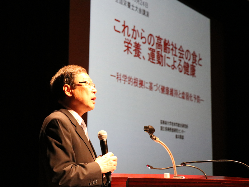 特別講演には、桜美林大学老年学総合研究所所長の鈴木隆雄先生が登壇し、「高齢社会における食と栄養、運動の意義 ―科学的根拠に基づく健康の維持と虚弱化予防―」と題して、今日から将来にかけての問題とその対策について数々の研究結果をもとにお話されました。まず鈴木先生は、前期高齢者(65~74歳)と後期高齢者(75歳以上)を健康度が異なる集団として分けて考える必要があるとし、今後、前期高齢者:後期高齢者の人口割合は2030年に1400万人:2270万人(1:1.6)、2055年には1260万人:2390万人(1:1.9)と推計され、後期高齢者の割合が急増していくことを示しました。そして、心身機能の減衰が顕在化してくる後期高齢者へのアプローチが非常に重要であると強調しました。