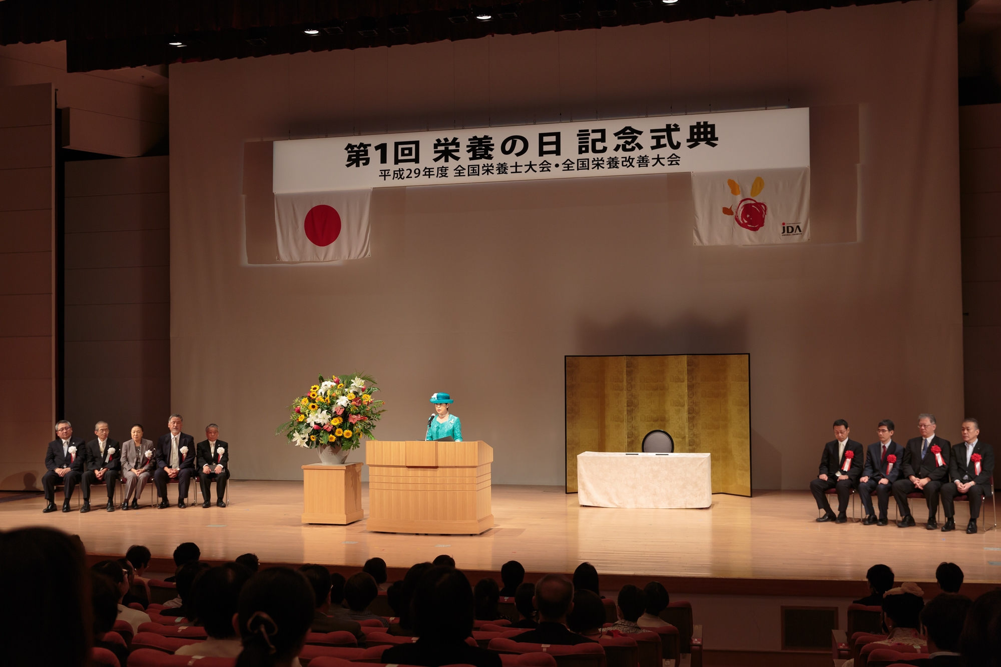 大会中の「第1回 栄養の日記念式典」には、高円宮妃久子殿下にご臨席いただき、「超高齢少子社会を迎えている今、誰もが健やかな生活を願う中で、栄養の重要性が見直されています(中略)。栄養の日の制定は大事な第一歩です。これからは国民の食と栄養の課題を解決するための運動を展開し、栄養の日をご支持いただいている多くの関係団体と協働し、いきいきとした元気な日本をつくっていただけたらと思います。世界には低栄養と過栄養の二重負荷の状況がとても多くあり、そこでの支援は必要不可欠です。このような要請に応えるべく、さらに研鑽を積み、世界各国の同じ業務に携わる方々とともに、人類の健康維持、改善に尽くされることを期待しております」とのお言葉をいただきました。