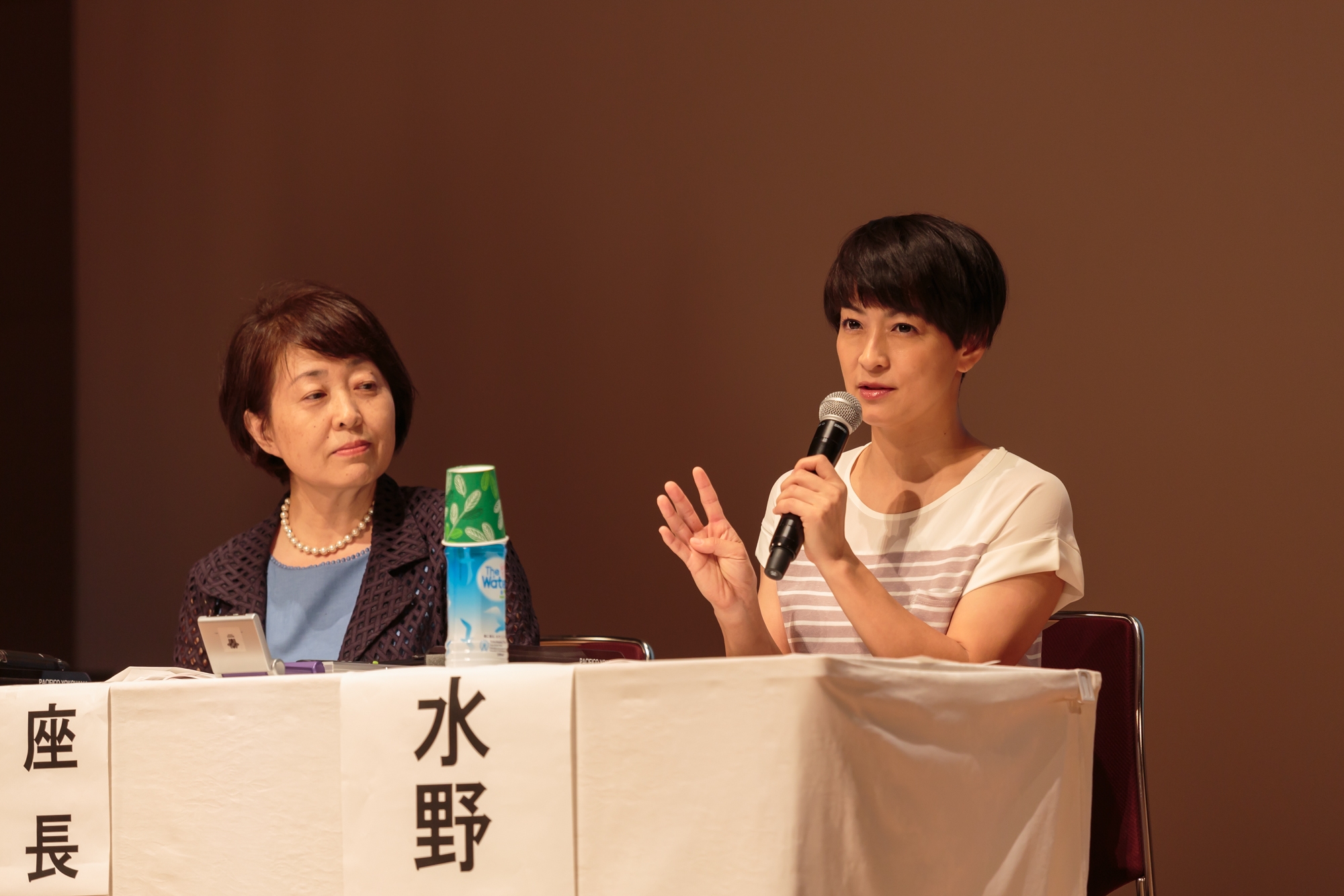 大会の最後には教育講演「水野裕子と学ぶ個人情報管理と職業倫理」が行われ、タレントで管理栄養士養成校に在籍中の水野裕子さんが弁護士の早野貴文氏に平成26年に改訂された「管理栄養士・栄養士倫理綱領」(平成14年4月27日制定)について疑問・質問を投げかけ、会場の管理栄養士・栄養士とともに理解を深めていきました。職業倫理について早野氏は「Professionalな人たちの倫理という意味であり、Professionalとは人の命を預かる仕事を指す。管理栄養士・栄養士は食と栄養を通じて人々の命を守ることが本質であり、そのために不可欠な意識を職業倫理と呼びます」と解説しました。そして、「国民は栄養の詳しい情報を知りません。目の前にいる管理栄養士・栄養士が誠意をもって最善の情報をくれると思っています。ですから、ネットで手軽に得た情報で伝えることは職業倫理違反の最たるものになります」と注意を呼びかけました。早野氏の説明を受けて、水野さんは「意識を高く持ち続けるのは難しいことではあるけれど、それがやりがいでもある。管理栄養士の資格を取得して、正しい情報、知識を持って伝えていけるようになりたい」と抱負を述べました。