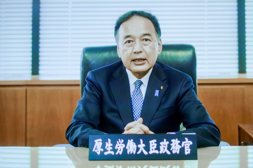 オープニングでは厚生労働省が作成した動画が流れ、日本の栄養政策の歩みが紹介されました。その後の来賓挨拶では、厚生労働大臣政務官の島村大氏がメッセージビデオで、「日本は戦前・戦後の食料難による低栄養、経済成長に伴う過栄養、さらに近年は『栄養不良の二重負荷』に対する取り組み等、各時代の栄養課題に合わせた栄養政策を推進してきました」と語り、具体的には「主食・主菜・副菜を基本とした『食事』、管理栄養士・栄養士等の『人材』の養成と全国への配置、国民健康・栄養調査等の科学的な『エビデンス』の3つを重視した栄養政策を展開することによって、世界一の長寿国の実現に寄与してきました」と、その成果を振り返りました。さらに、新型コロナウイルス感染症の世界的な感染拡大によって世界各地で経済格差が拡大し、食料へのアクセスの悪化が生じていることによる、栄養不良の人口の増加を示唆したうえで、「日本の誇る栄養士制度を世界に向けて発信し、『誰一人取り残さない』持続可能な社会を実現していきましょう」と呼びかけました。