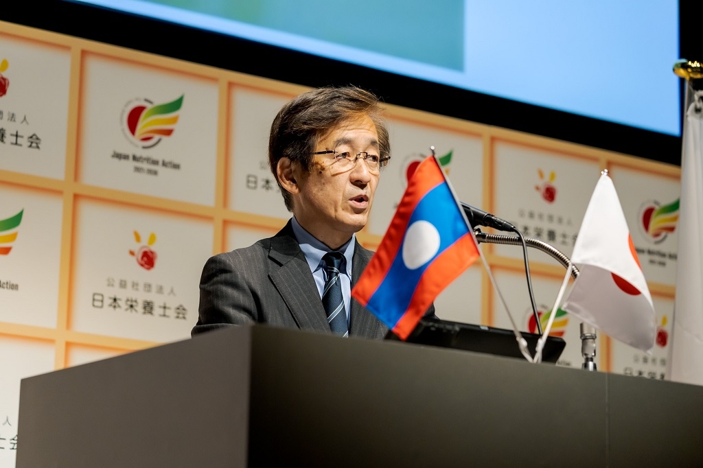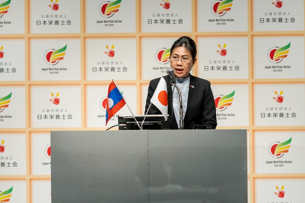 公式サイドイベントには、在日ラオス特命全権大使であるフォンサムット・アンラワン閣下が登壇し、「ラオス政府は国の経済的、社会的発展とともにSDGsを達成するには栄養の確立が重要だと考えています。これまで諸外国よりラオスの小学校給食に支援がありましたが、給食は持続的に実現できていません。ラオス政府は栄養の事業を続けられるように日本政府に支援をお願いし、日本栄養士会に正式に依頼をしました。国の将来を担う子どもたちの健康に栄養は重要です。これから緊密に連携していきたいと思います。ありがとうございます」と述べました。