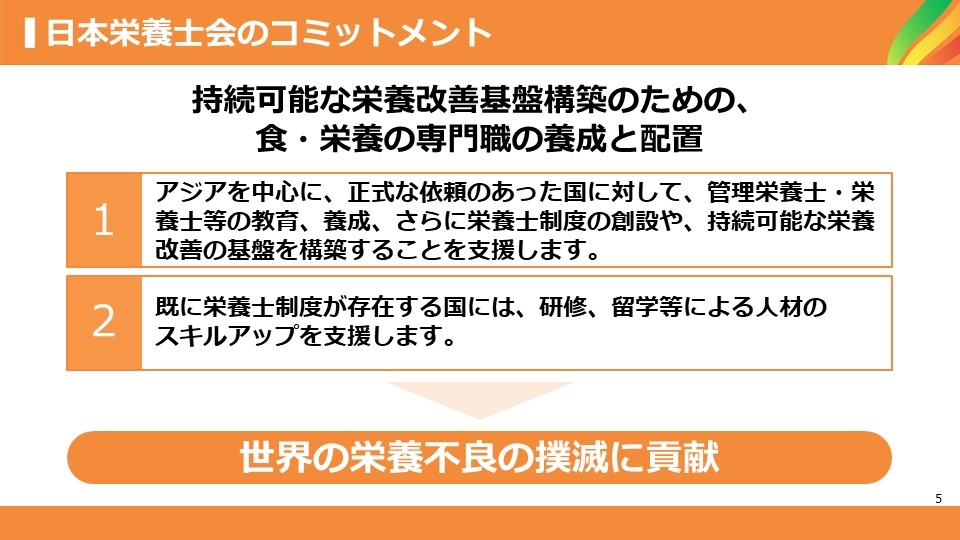 日本栄養士会と全国47の都道府県栄養士会では、SDGsの達成、世界の栄養不良の撲滅に向けて動き出します。その決意表明を、メッセージビデオとして上映しました。