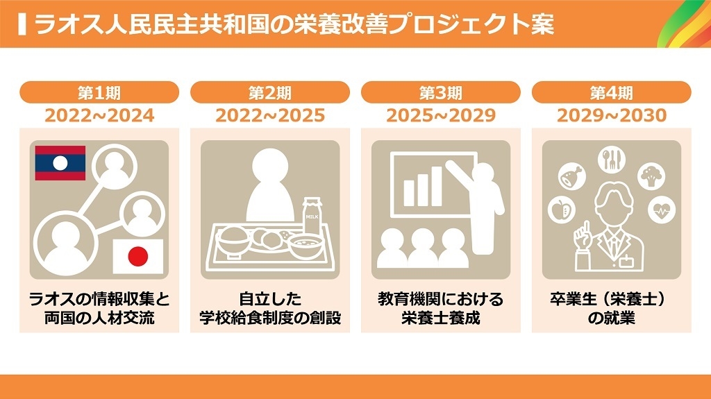 日本の栄養の100年の歴史と、ベトナムでの栄養士制度設立の実績を生かして、日本栄養士会ではラオスでの栄養改善プロジェクトについて2030年までを第1期から第4期にかけて、次のように進めていく予定です。