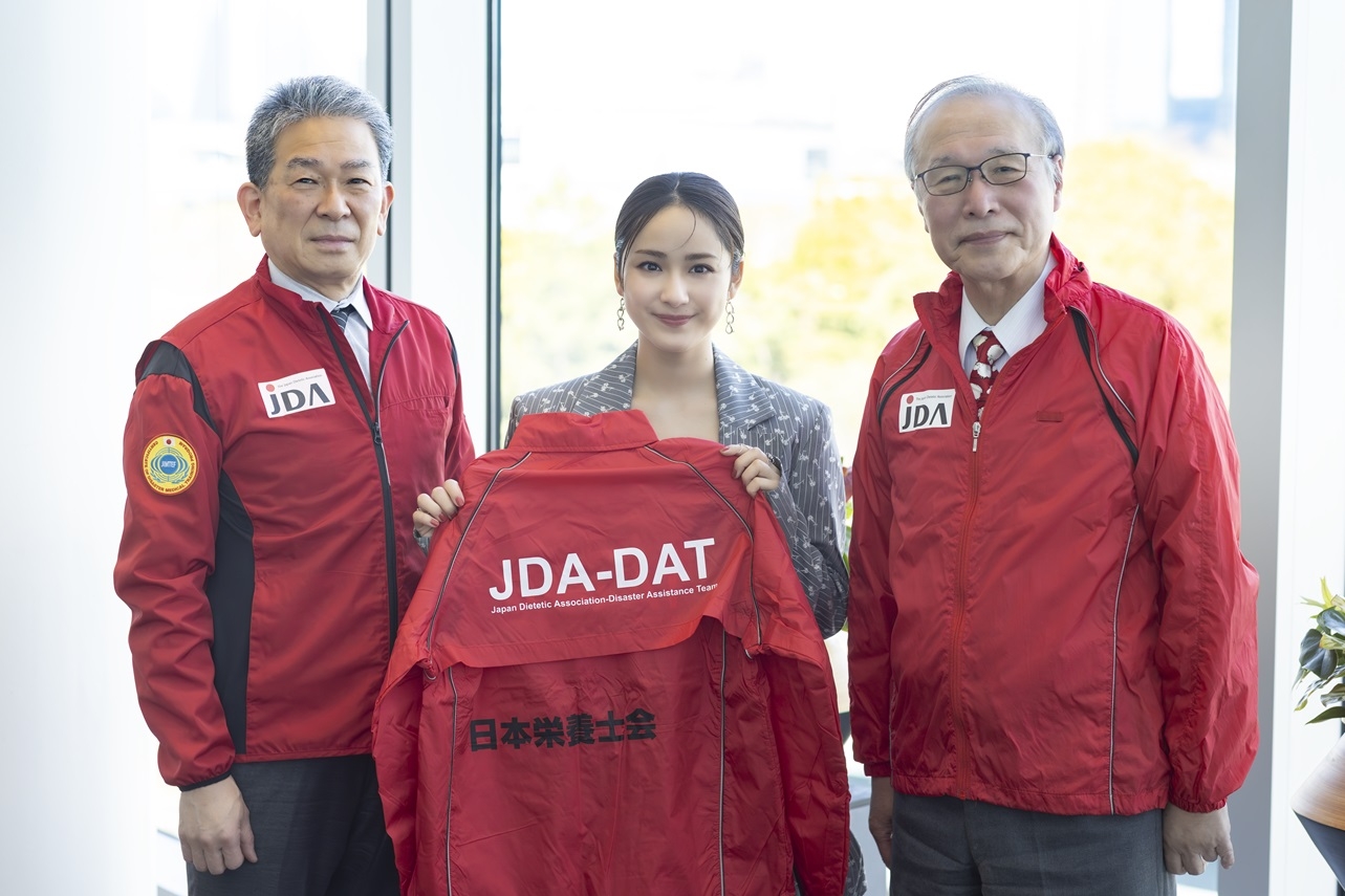 日本栄養士会災害支援チームのユニホームを手にした平さん(中央)、中村会長(右)、JDA-DATを総括する下浦専務理事(左)