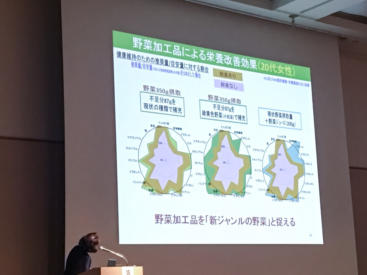 また、佐藤氏は「野菜ジュース等の野菜100%加工品は"野菜代わり"になるか?」との疑問を会場に投げかけました。