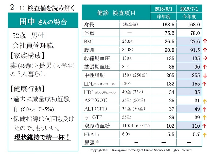 佐野氏は、行動科学的手法を使った特定保健指導の具体例を紹介するために、対象者として「52歳男性、会社員管理職の田中さん」の検査値と問診票をスライドで示し、会場の参加者に語りかけました。