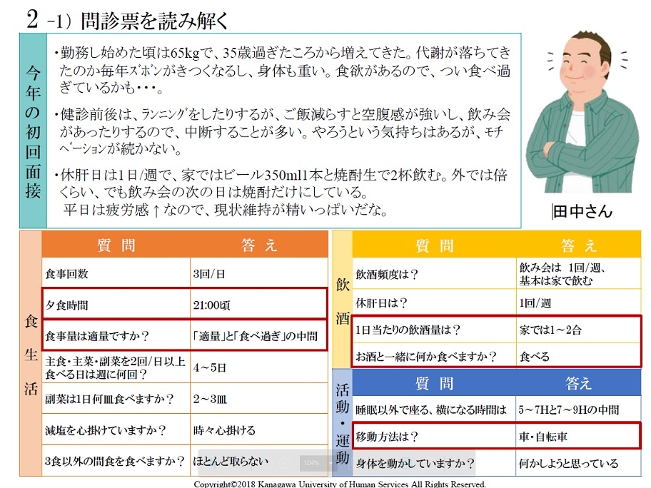 「田中さんは、保健指導は何回も受けたのでもういい、と言っており、"現状維持で精一杯"と話しています。この場合、私たちが注目するべき検査値はどれですか? また、問診票のどこが気になるか、隣の人と話してみてください」