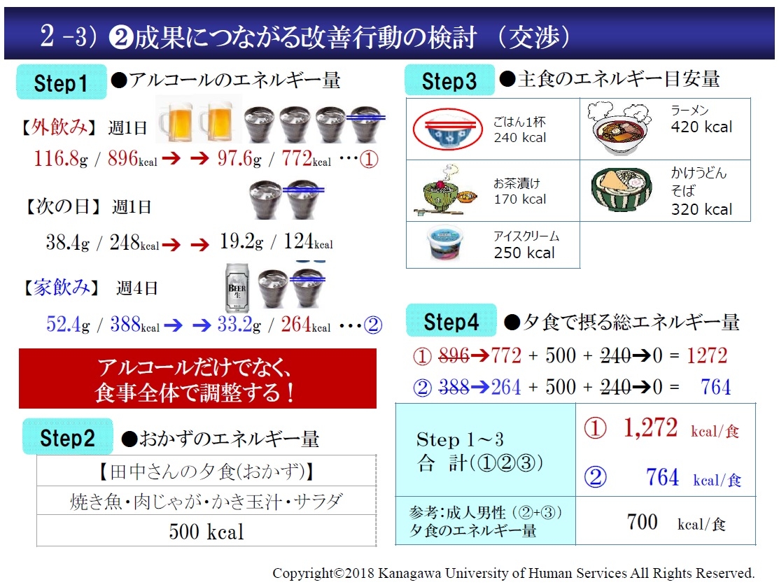 「夜遅い食事には内臓脂肪が蓄積しやすいというデータを示すこと。また、管理栄養士はアルコール量を"純アルコール量"で考えがちですが、一般の人は容量でイメージします。なので、摂取量と純アルコール量の換算表を作っておくのも必要ですね。皆さんの中には飲酒の指導が苦手な人もいて、1回の量がそれほど多くなかったり、休肝日があると聞けば、指導をしないこともあるのでは? それは反省してくださいね。短期間でも主食を減らす場合は、たんぱく質の摂取比率が高まるので、検査値の確認も重要です」