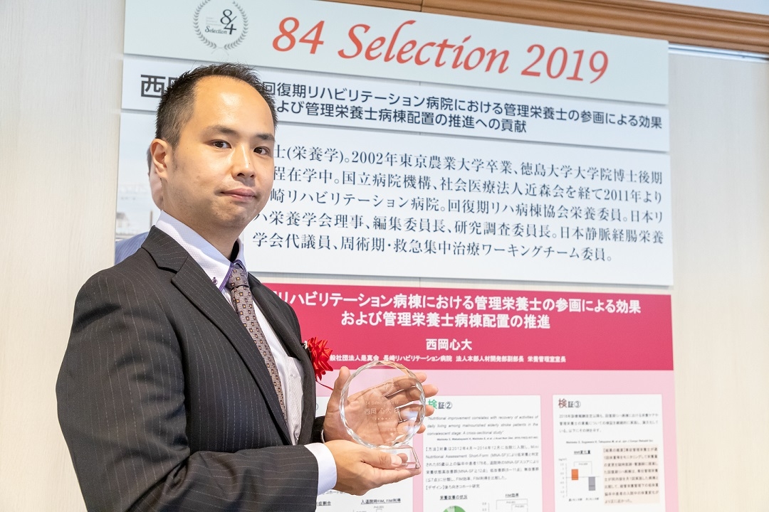 長崎リハビリテーション病院の管理栄養士、西岡心大さんは、2018年の診療報酬改定の際に評価された「回復期リハビリテーション病院における管理栄養士の参画による効果および管理栄養士病棟配置の推進への貢献」が、受賞の決め手となりました。
