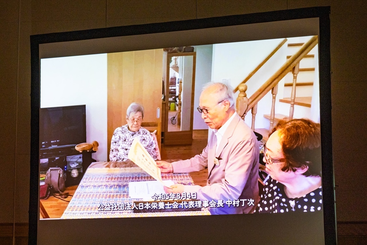 本年より日本栄養士会表彰に「永世栄誉会員」と「栄養橋寿会員」が設けられました。「永世栄誉会員」は今年100歳を迎えられた会員に、長年、日本栄養士会を支えていただいている感謝とこれまでの功績を称えて贈るものです。第1号受賞者となった、公益社団法人福岡県栄養士会に所属する秋永光子さんのご自宅に日本栄養士会 中村丁次会長と下浦佳之専務理事、福岡県栄養士会 大部正代会長と渡邉啓子常任理事がうかがい、表彰状をお渡しした様子がビデオで上映されました。「思いがけず皆さんに祝っていただいて、うれしいことでございました」と笑顔で話される秋永さん。中村会長の「後輩がたくさん育っていますね」との問いかけに深くうなずかれるお姿に、会場の空気もやわらぐひと時となりました。