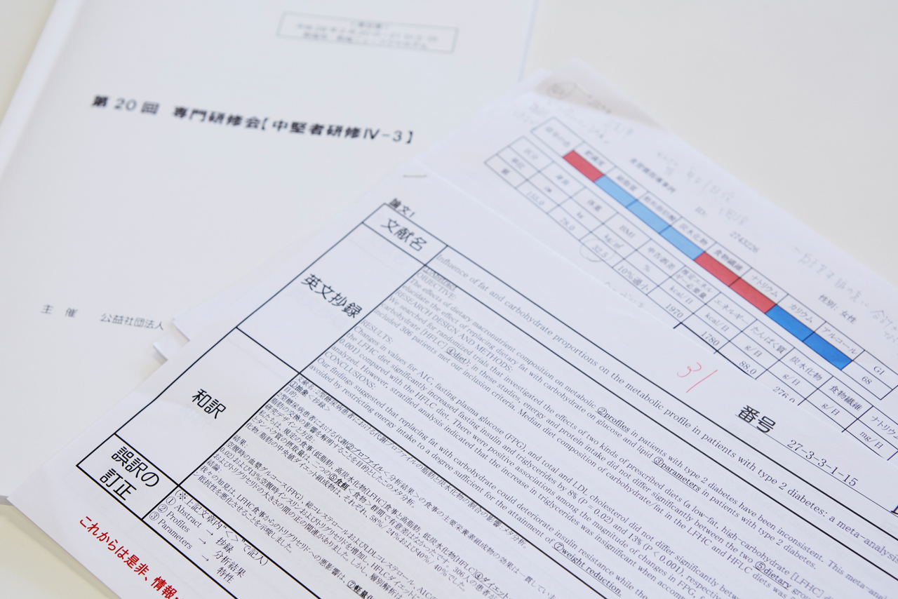 福祉事業部の中堅者研修では、各自の食事アセスメントの個人結果帳票を用いた食習慣指導法をグループワークで行い、ロールプレイで発表し、受講生同士が質問・討議することで、対象者の食べ方に合わせた食習慣指導を習得できることやこの機会にしか得られない他者の考え方も多いそう。前述にある「日本人の食事摂取基準」の監修者である東京大学大学院・教授の佐々木敏先生、管理栄養士の教育ツール「TNT-D」(日本栄養士会)のアドバイザーを担当した武庫川女子大学・教授の雨海照祥先生が質問・討議に加わり、アドバイスしてくださるという貴重な体験ができることにおいても、「非常に贅沢な研修会だと思います」と話す市川さんの体験談には、ポジティブな意見や大変さを示唆する言葉もありました。