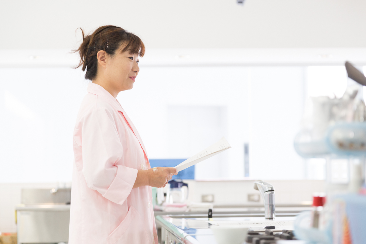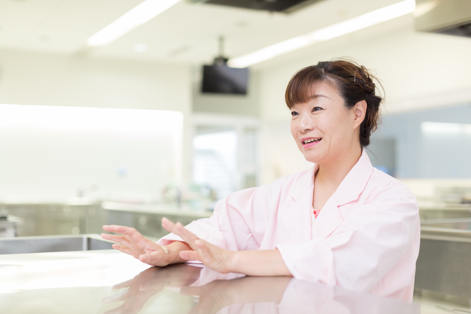 整理整頓された調理実習室で。授業や研究で1日の多くの時間をここで過ごします。