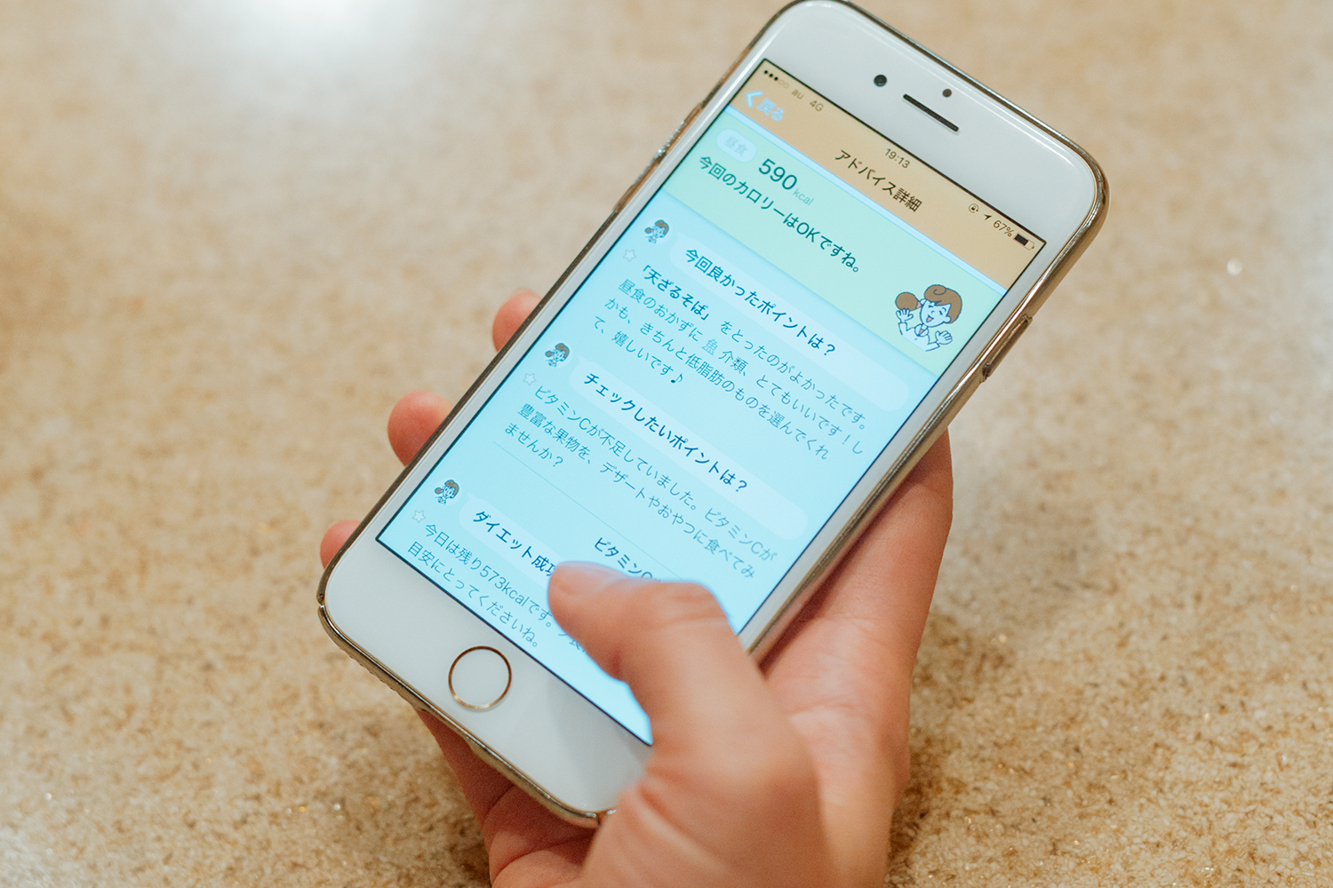 ユーザーがスマートフォンで「ご飯(1膳・150g)、鶏肉の唐揚げ、温野菜を食べた」と入力をすると、管理栄養士のキャラクター"カロリーママ"が「カロリーコントロール、栄養バランスともに素晴らしいです!!」と大喜びのニコニコ顔で返事をしてくれる――。健康についてのアドバイスを毎日、毎食ごとにくれるスマートフォン向けアプリが、佐々木さんを中心に開発した「カロリーママ」です。平成28(2016)年4月に無料アプリとして開始して、約1年で累計ダウンロード数は10万近くに及びます。