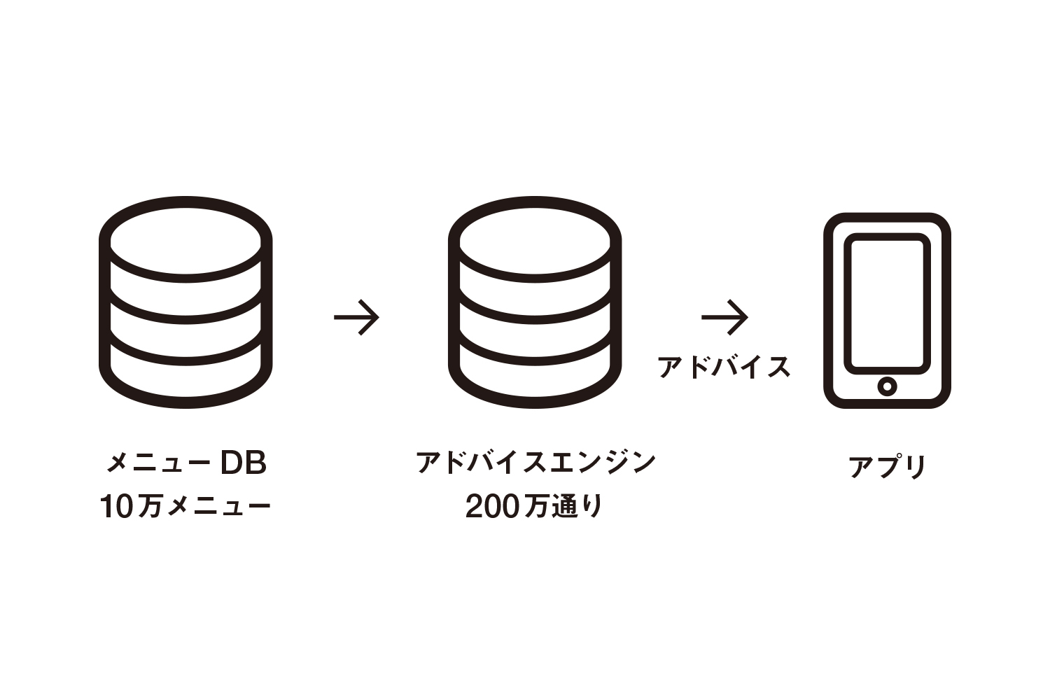 用意したメニューは約10万。それぞれのメニューに対してカロリーと各栄養素がどれくらい入っているのかを設定し、メニューの組み合わせに対応する管理栄養士のコメントは約200万通りを用意したそうです。このアルゴリズムの制作におよそ1年をかけ、アプリにするために開発を始めたのが平成27(2015)年の9月。その半年後にリリースしました。