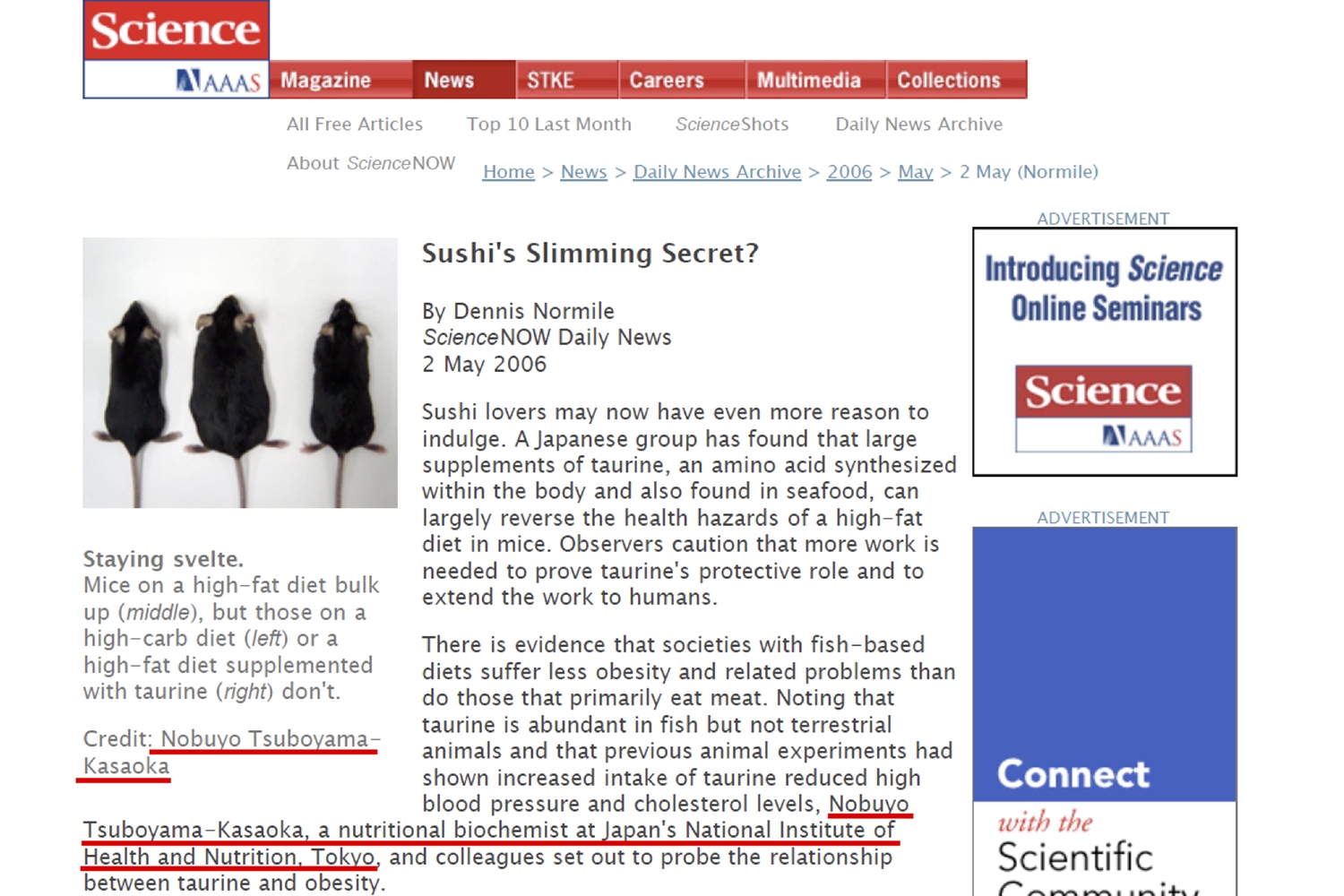 大学院生の頃には、EPA、DHAといった魚油、タウリンの研究をスタートさせており、平成18(2006)年にはタウリンが肥満に効果があるというメカニズムを笠岡さんが世界で初めて明らかにしました。世界トップの科学誌Scienceに話題のニュースとして掲載され、国内では論文「魚介類含有成分における肥満抑制に関する研究:魚油およびタウリンの作用」が平成19(2007)年の日本栄養改善学会奨励賞を受賞しています。