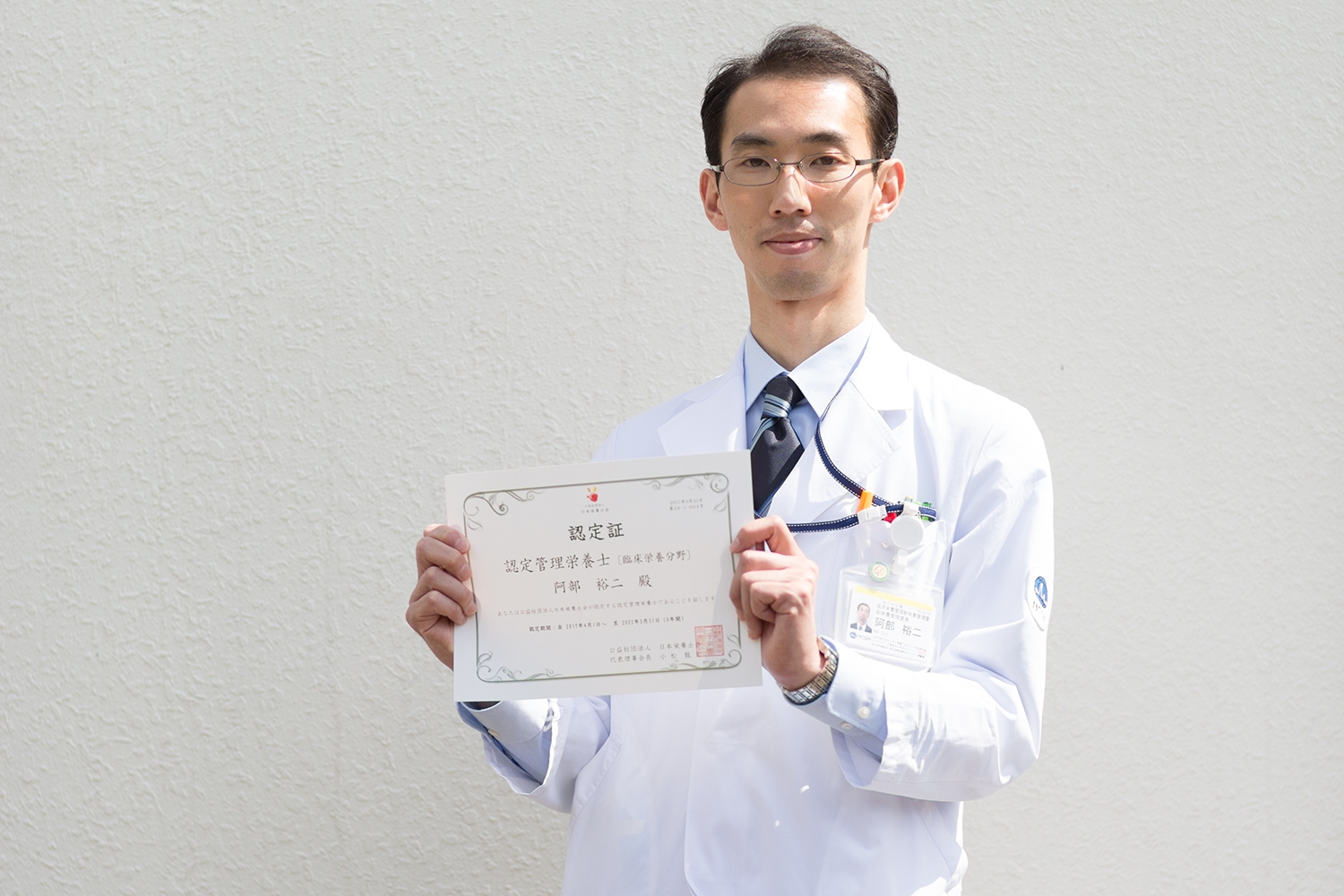 臨床栄養分野で認定管理栄養士に認定された、阿部裕二さん(38歳)。国立国際医療研究センター国府台病院で副栄養管理室長を務めています。