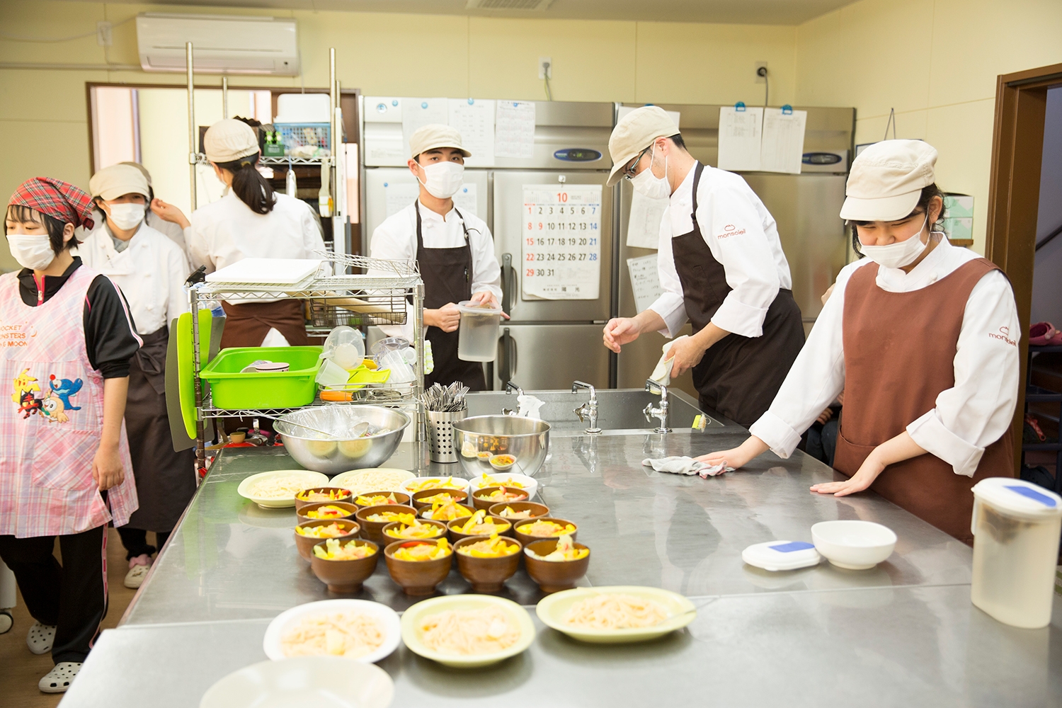 日々の事業所では、昼食作りも仕事の一つ。毎週土曜日のミーティングの際に翌週に食べたい料理の希望を出し合い、村上さんが管理栄養士の視点でアドバイスを入れながら係の店員とともに1週間の献立を組み立て、主食・主菜・副菜(汁物)のメニューに調整します。すべての店員には週に1回この「給食作り」の仕事がまわってきて、パン作りの作業以上に楽しみにしている人も。この日のメニューは、めんたいことじゃがいものパスタ、レタスとパプリカのサラダ。高校生の実習生分も含めて18食を店員4人と職員2人で作りました。