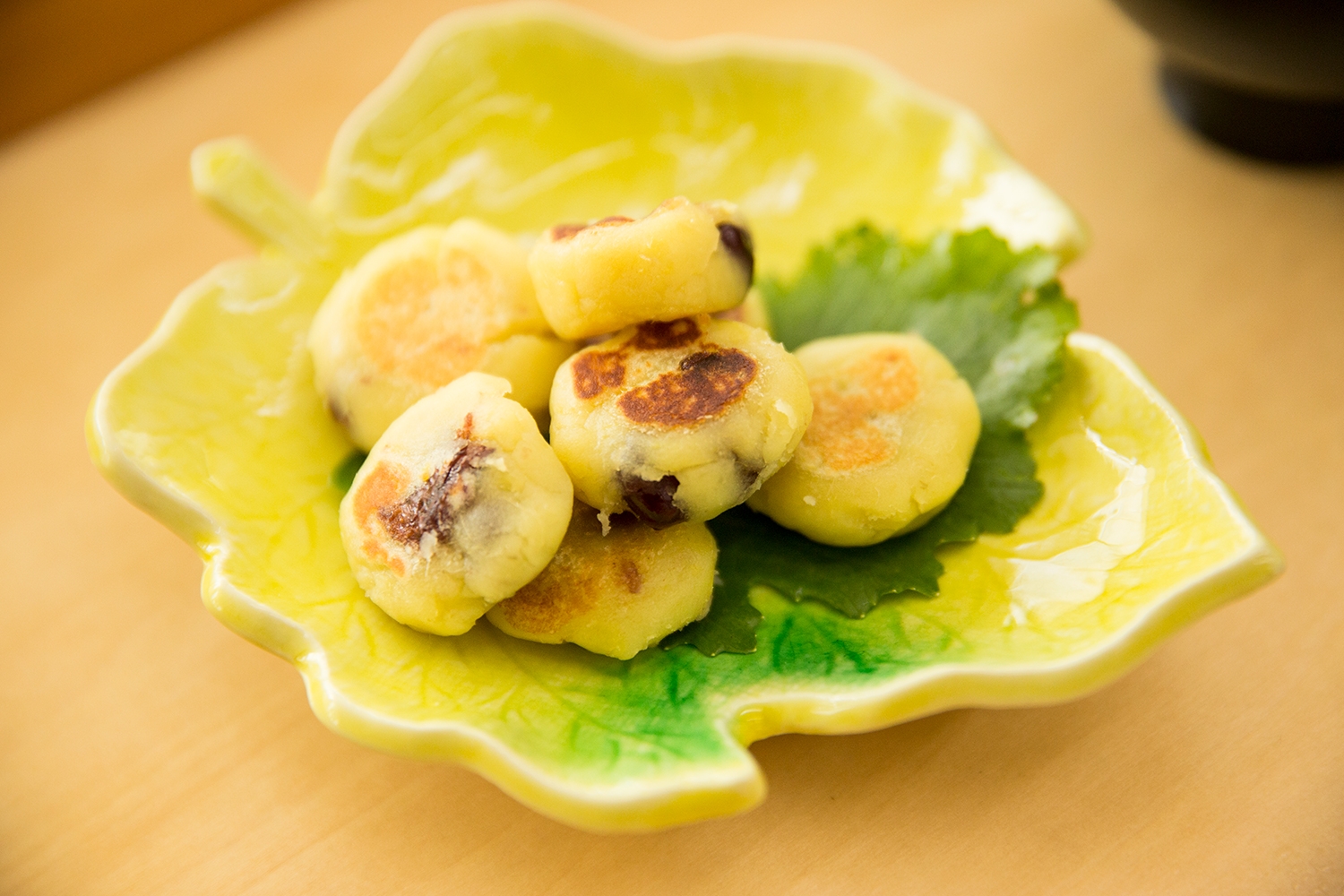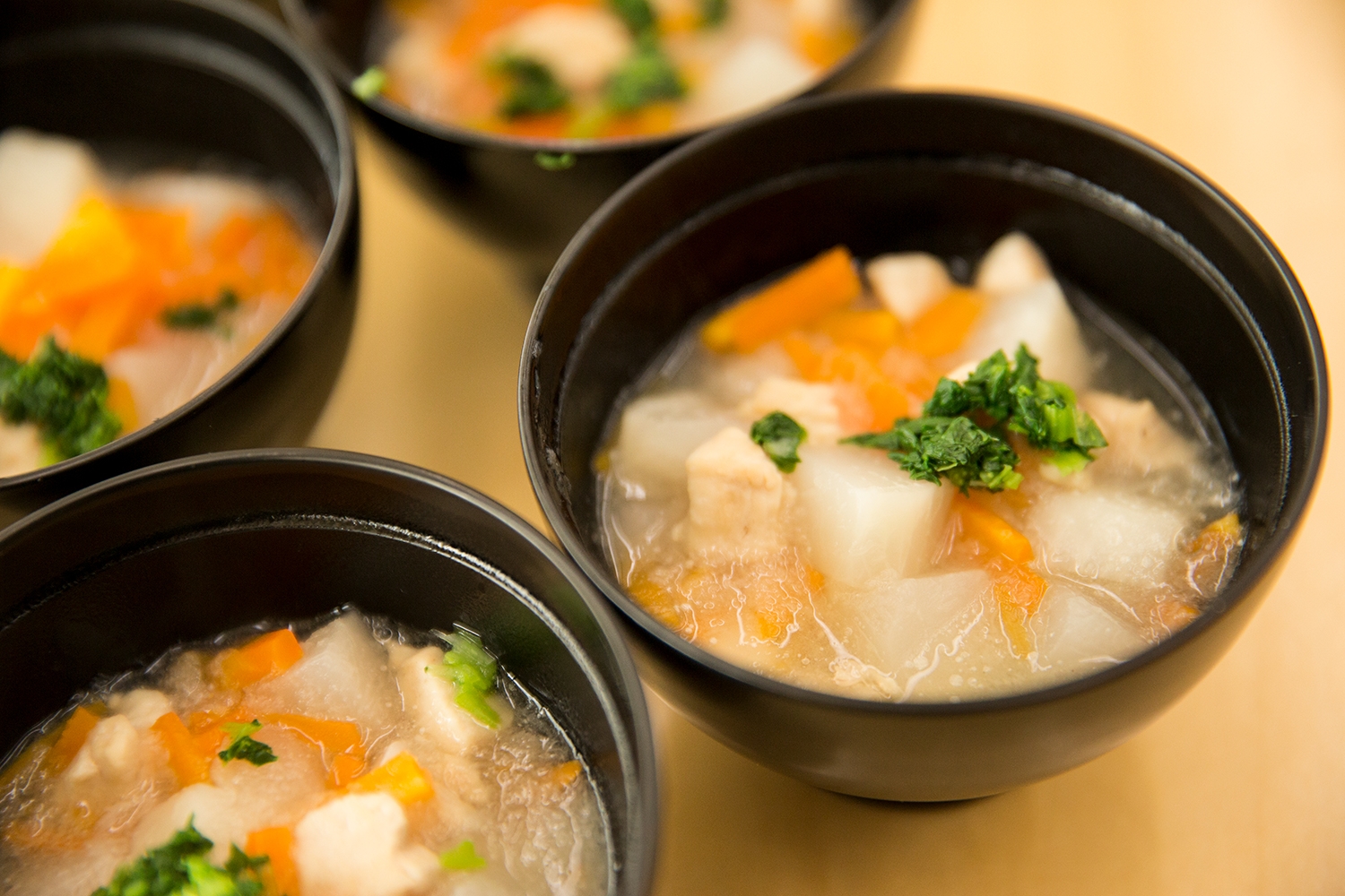 まずは「かぶのとろみスープ」。地元亀岡産の「かぶ」をもっと食してもらおうと、「洋風」にアレンジ。昆布だしに、この27品目不使用の洋風だしをプラスして鶏肉やにんじん、かぶを煮込み、仕上げにすりおろしたかぶを加えて白さととろみを出します。すりおろしたにんじんとツナ(水煮缶)を加えて炊き上げた洋風ピラフのような炊き込みご飯は、名付けて「夕焼けごはん」。蒸してマッシュしたさつまいもに片栗粉と植物油、そして甘納豆を加えて焼いた「さつまいももち」はスイートポテトのようにしっとりとした甘みで、気持ちも和らぎます。