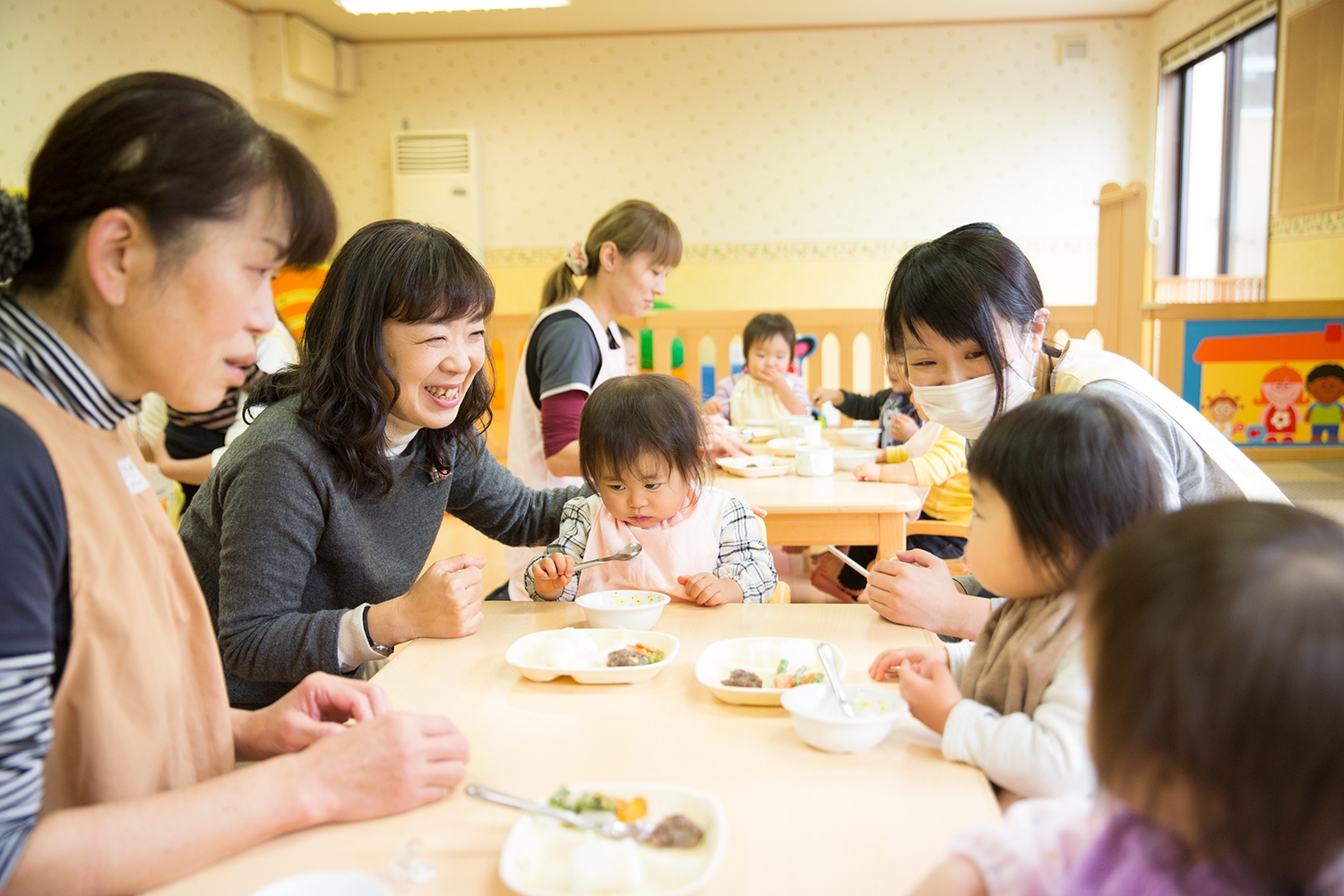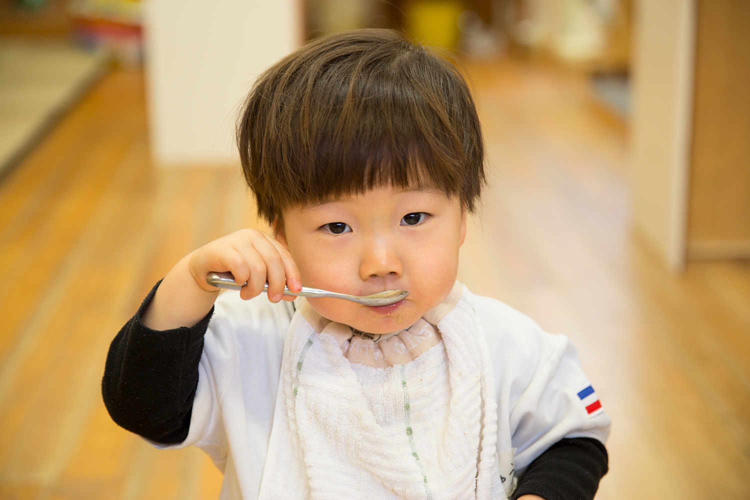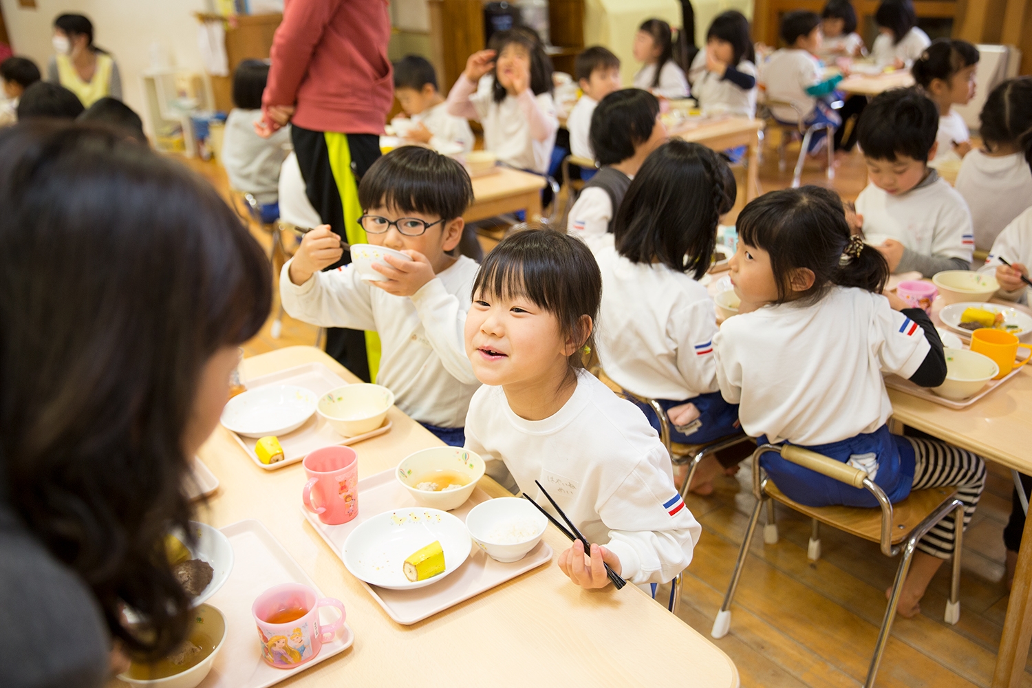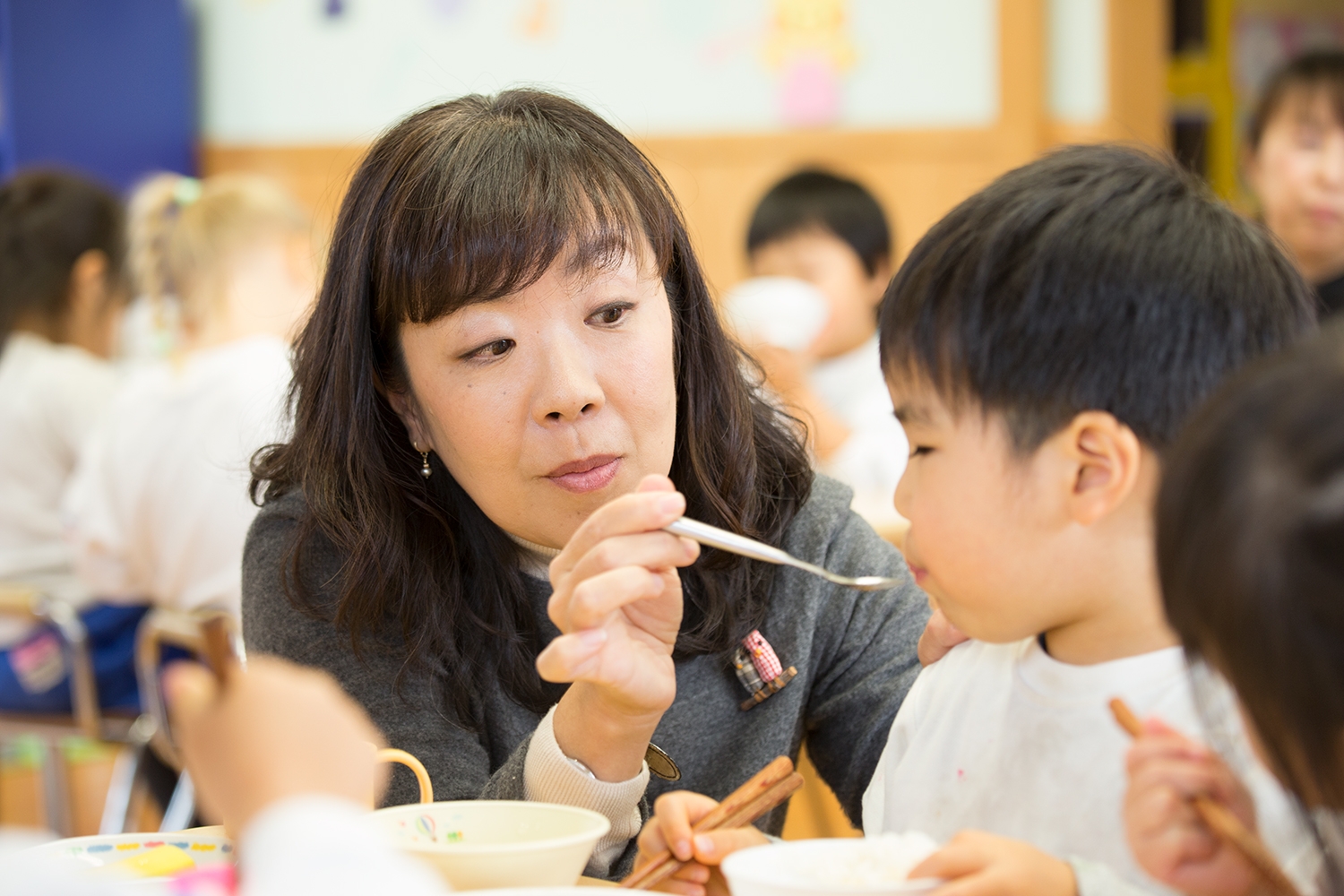 講演の翌日は、京都府北部にある舞鶴市のルンビニ保育園へ。伴さんは給食アドバイザーとしてかかわっています。給食の時間に子どもたちの食べる様子を見て、口の動き方から噛み方に偏りはないかどうか、舌がしっかりと動いているかどうか、スプーンやフォーク、お碗の持ち方がおかしくないかを確認していきます。癖がありそうな場合には、担任の保育士や管理栄養士・栄養士、調理担当者にも同席してもらい、日ごろどのように指導をしたらその子が食べ方を改善できるか、食べやすくするための食材の大きさや硬さ、切り方など変更するポイントをアドバイスしていきます。