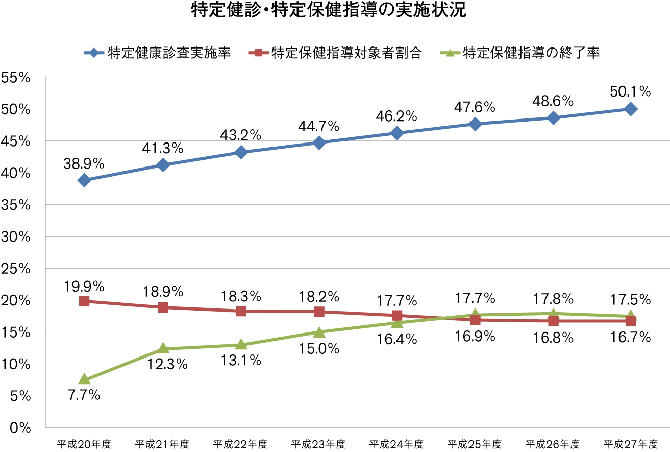 というのも、下のグラフのとおりメタボ健診はこの10年で受診する人が毎年着実に増えていて、日本全体では50%を超えました(平成27(2015)年度)。しかし、その健診後の特定保健指導の終了率は相対的に増加はしているものの、まだまだ低いのが現状です。つまり、メタボ健診は受けるけれど、"受けっぱなし"の人が多いのです。