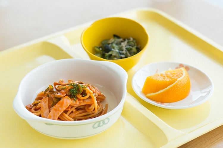 「みかづき食」の内容は、食事の見た目の圧迫感を少なくするよう食事量を通常の半分程度に調整し、さらに「さっぱり味」と「はっきり味」の2つセットのどちらかを患者さん自身が選べるのが特徴です。食欲不振であっても、濃い味のほうが食べやすい方もいれば、あっさりしたものを好む方もいるためです。はっきり味にはナポリタンやカレーうどん、たこ焼きなど、さっぱり味には細巻きずしや、卵雑炊、おにぎりなどの料理が揃います。