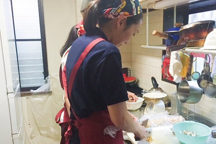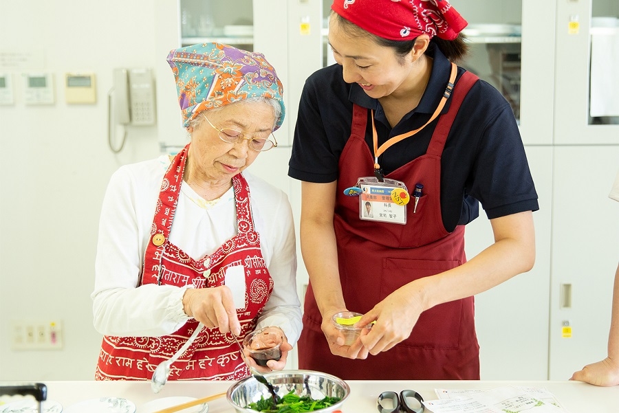 2019年6月には、「無理なく! 美味しく! 楽しく! 減塩」という料理教室を企画しました。病院の中ではなく、駅前の複合型公共施設の調理実習室で開催して利便性を高め、市内をはじめ近隣の住民たち約10人が参加しました。企画の責任者である栄養部科長の宮司智子さんは、一方的に講座を進めることはせず、参加した住民たちが主体的に調理に取り組めるように、全体的なサポートに徹していました。