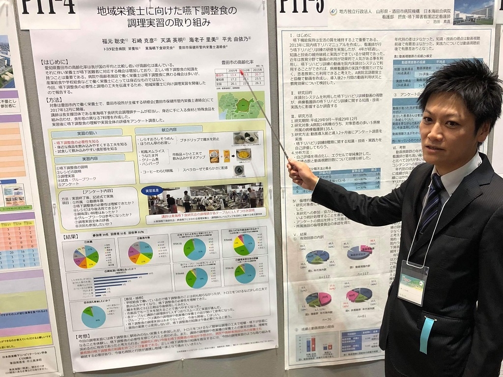 「当院の患者さんだけでなく地域の全ての方々へ、より良い栄養管理や栄養指導を提供したい」。対象者である患者さんや高齢者、ビジネスパーソン、子どもたちに接するたびにこのような思いを強くし、自己研鑽に励む、福元聡史さん。病院での管理栄養士業務を行う中で、この思いを常に持ち、大学院で学びを深めながら、院内だけでなく地域そして社会へとその活動範囲を広げています。
