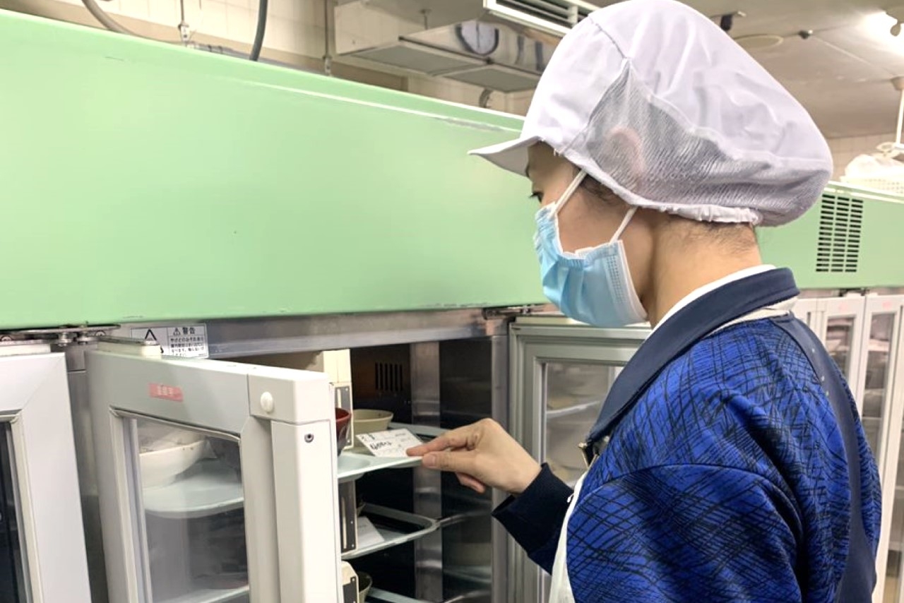 新入職員が一人前として仕事をこなせるようになるまでは、育成には時間をかけています。上述の弁当シリーズが担当できるのは、新人にはまだ先のこと。まずは、厨房業務の中でも盛り付けと洗い物に専念、利用者個人の好き嫌いなども反映させた食札の見方をしっかりと覚えてもらいます。その後に、献立と発注。これらがこなせるようになったところで、ようやく行事食や弁当シリーズを担当できるようになります。